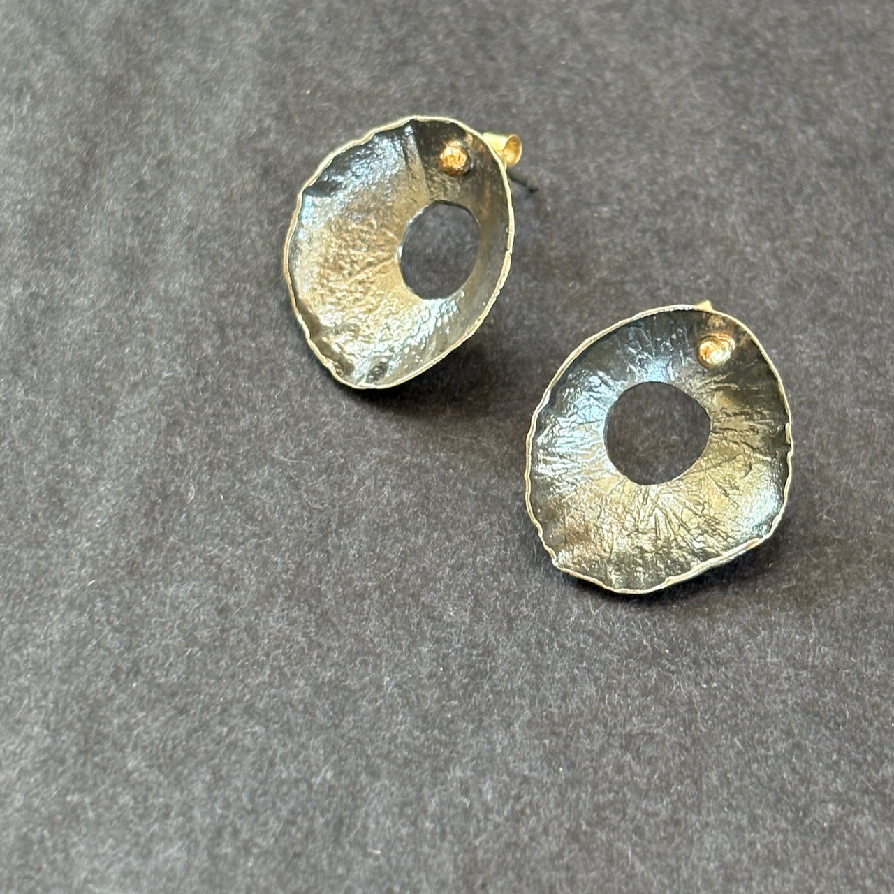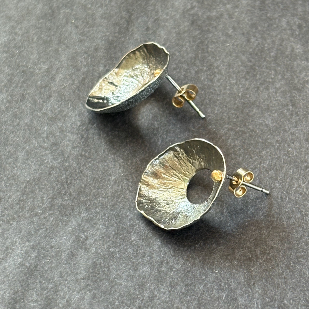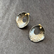 Organically created silver Sea Siren earrings with delicate hand created surface details, gold accents and gold ear post/backs.