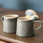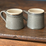 Tall mug, wheel thrown in white stoneware clay, with a pulled handle. Glazed with a gloss transparent interior, with a matte exterior.