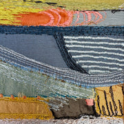 Observing the colours, patterns and textures of the land and recording these emotions as expressive paintings is the starting point for all Sarah’s energetic embroideries. The first layers of these textile works are the result of a selection process of an artist’s eye, choosing fabrics that start to tell a story; often a snippet of a sari from a friend or the sleeve of a velvet shirt from her sister. The fun begins here with her trusted sewing machine and free-motion embroidery using loose expressive marks to build up layers that take the viewer on a journey over the surface of the work. The incidental distortions of the fabrics are all part of of the resulting rich textures. Combining velvets and shot-silks with matt and lustrous threads are her tools to develop dynamic layers and balance.