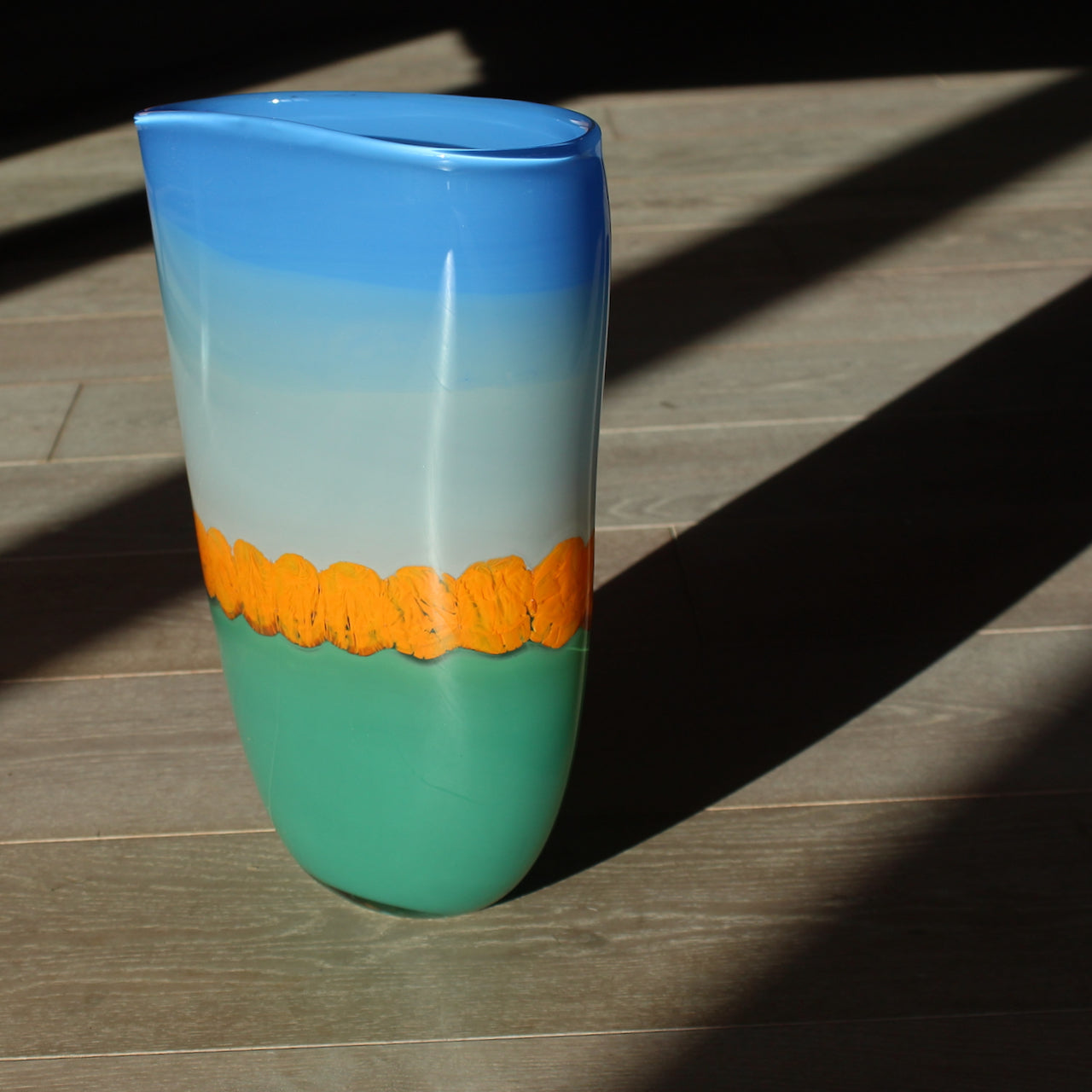 In 2020 his ‘Sigma’ series of work was selected for the Milano Vetro 35, and he was invited to show his ‘Aegean’ series at the Venice Glass Week. Whilst showing in Venice, Benjamin was invited to join the staff at Wave Murano Glass and he now lives and works on the island of Murano in Venice making his artwork at the glass factory.