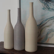 A collection of three of Lucy Burley's elegant and distinctive ceramic bottles in neutral shades Ivory (tall) 27cm, 20cm; Pebble, 24cm and Ivory (small) 23cm.