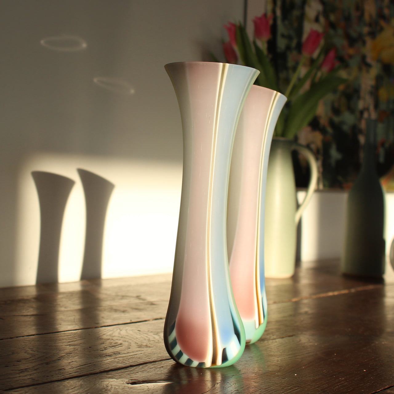 Ruth Shelley specialises in contemporary glass design. Her works' signature is the use of vivid, dramatic colour in kiln formed glass. Taking her cue from her love of traveling, Ruth Shelley's inspirations derive from her observation of colour, balance and tone of nature. Through layered glass she creates a dialogue of lines, patterns and colour. Ruth always observes how the colours and layers combine as a whole, and how light illuminates them.