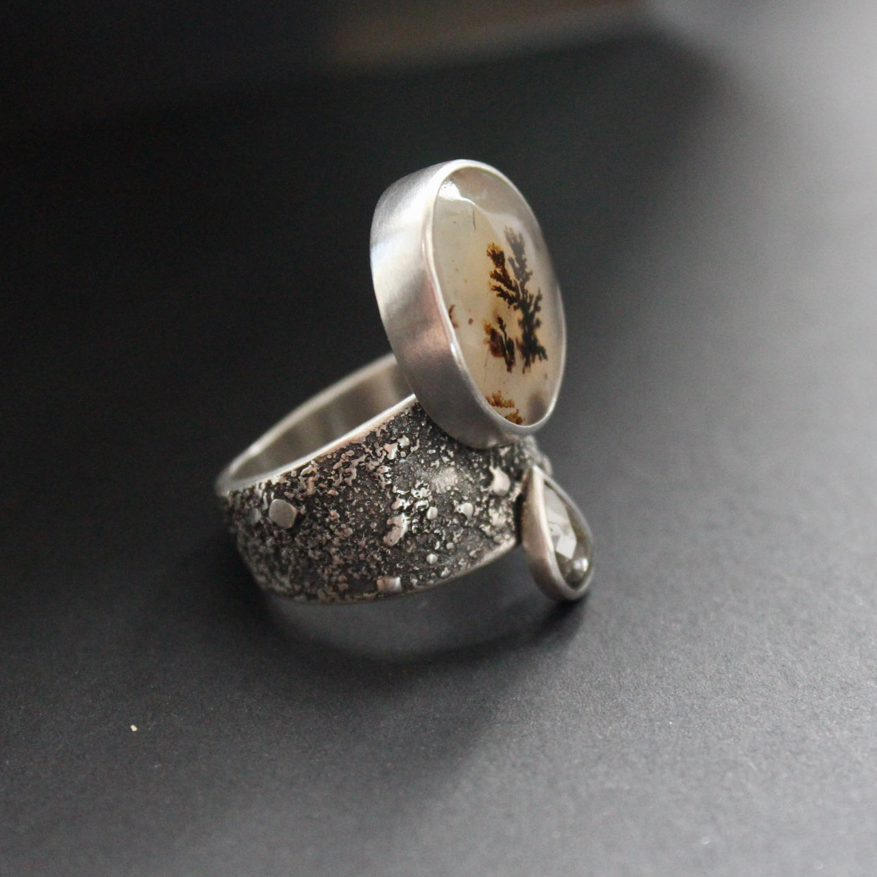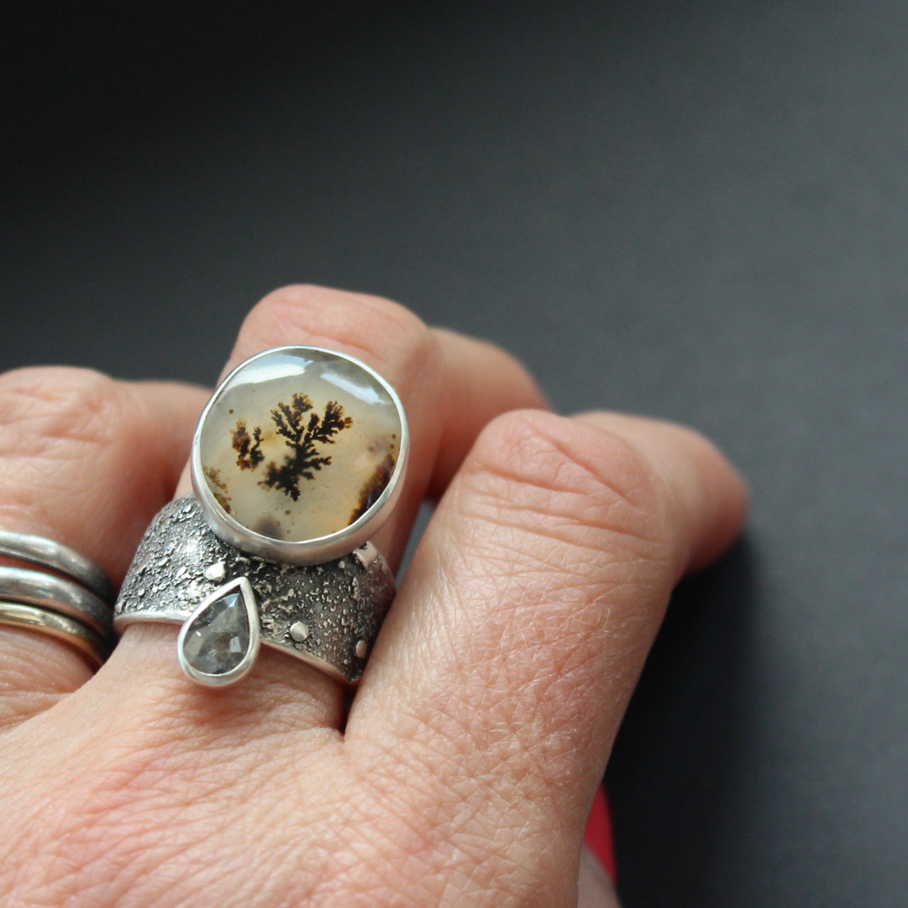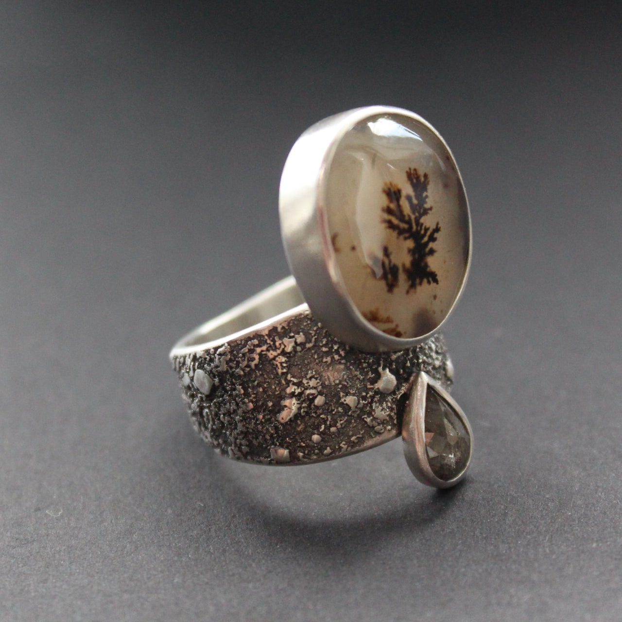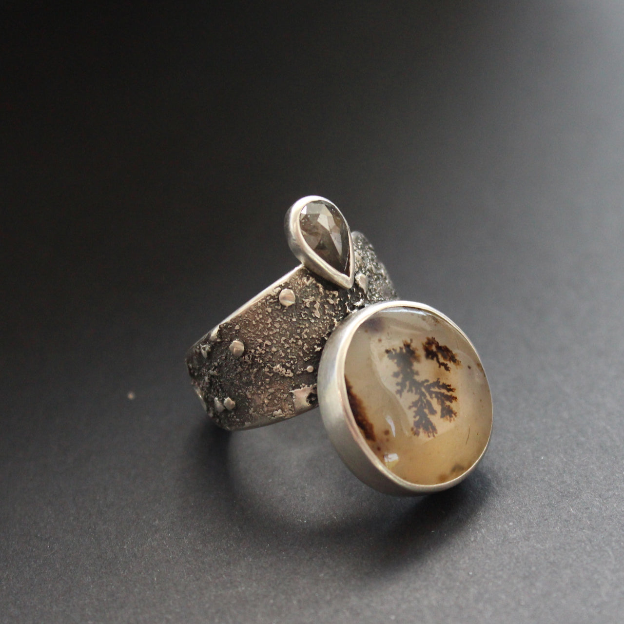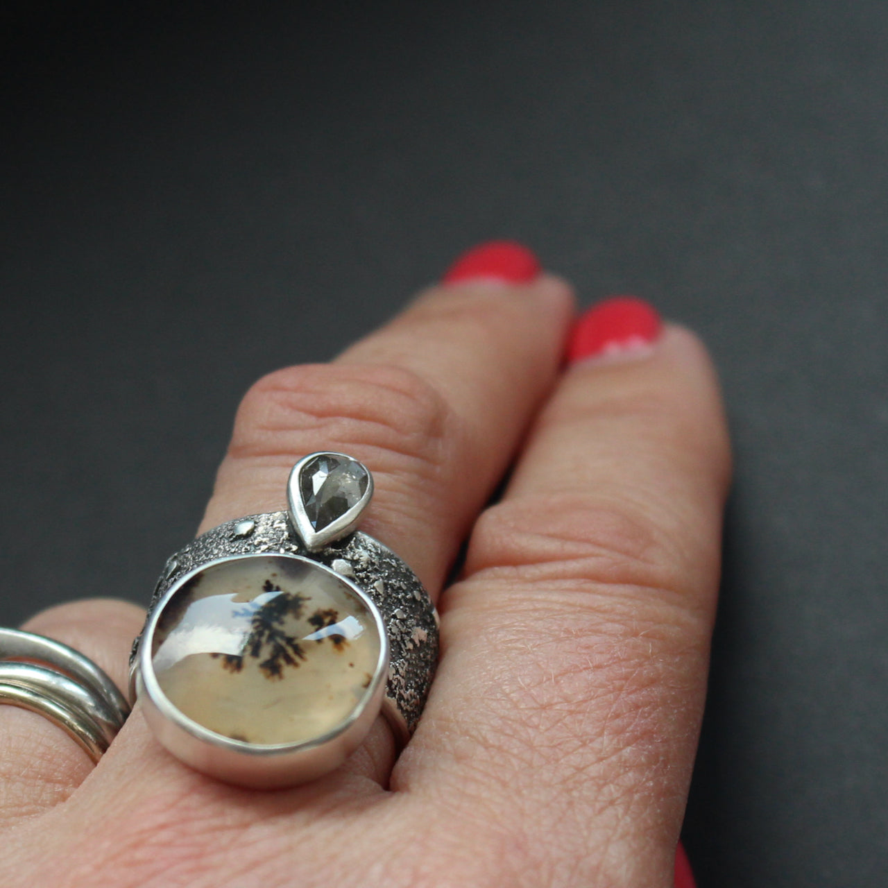 Carin Lindberg - Dendritic agate and grey rose cut diamond in textured silver