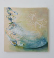 Liquid, dynamic paint layers of varying consistencies are combined with fleeting, but more carefully drawn or carved glimpses of recognisable elements of aquatic life, from the birds overhead to the seaweed below. She challenges myself to create something unexpected in each painting, something that prompts a second look; she works until every piece expresses what feels like a truth about the pleasures and surprises of immersion in wild nature.