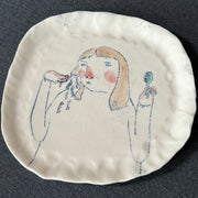 Working in porcelain and stoneware, Becca combines drawing and printmaking to build narrative on the surface of decorative hand-built ceramics. Gathering inspiration from mundane scenes, moments of connection and half-remembered Scottish superstitions, Becca ensures fingerprints, brush strokes and making marks are intentionally left exposed to accentuate the relationship between vessel and subject.