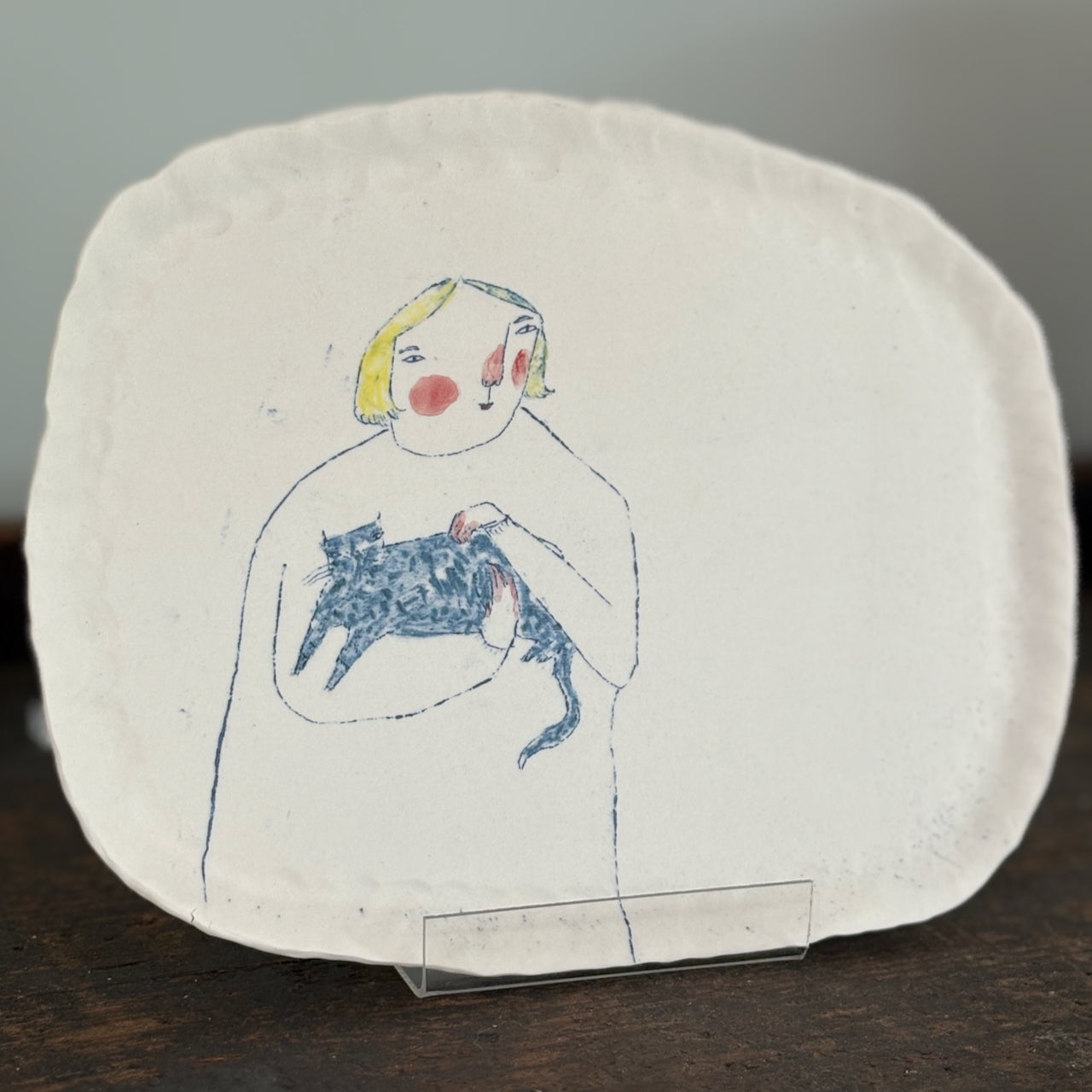 Working in porcelain and stoneware, Becca combines drawing and printmaking to build narrative on the surface of decorative hand-built ceramics. Gathering inspiration from mundane scenes, moments of connection and half-remembered Scottish superstitions, Becca ensures fingerprints, brush strokes and making marks are intentionally left exposed to accentuate the relationship between vessel and subject.