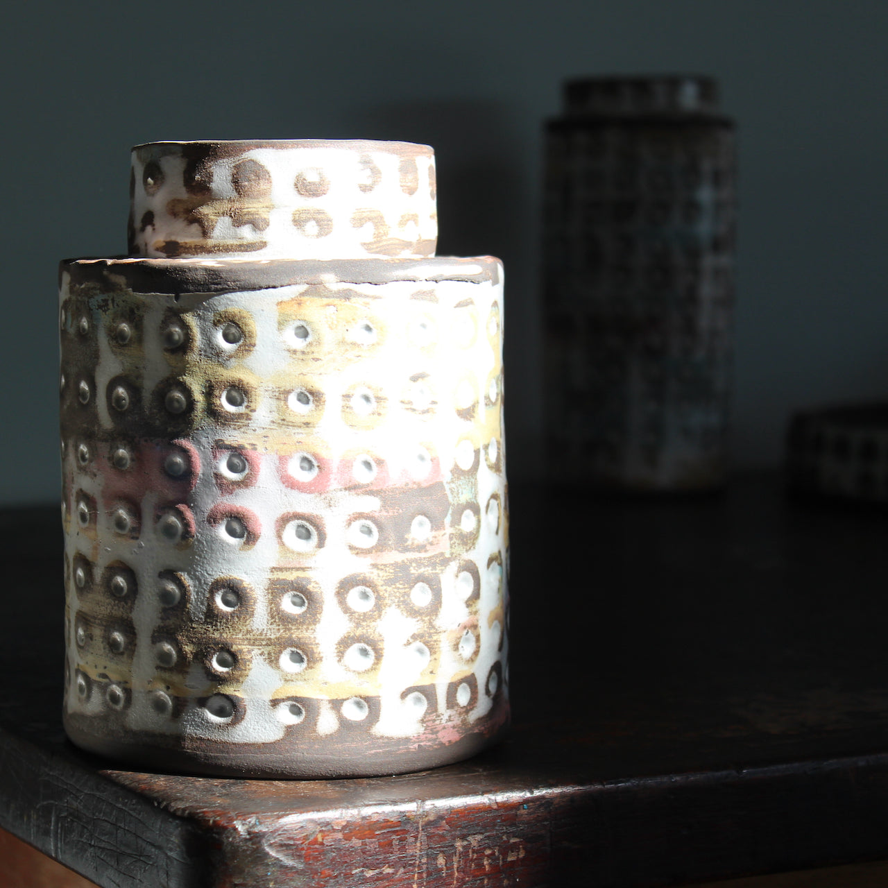 Both the form and texture of Elly’s vessels are influenced by her continuing fascination with empty and forgotten old public buildings and structures; she draws on the physical and historical layers of these spaces in creating her fascinating empty vessels. Elly took a masters in ceramics from the Royal College of Art, and works from her studio in Hertford.