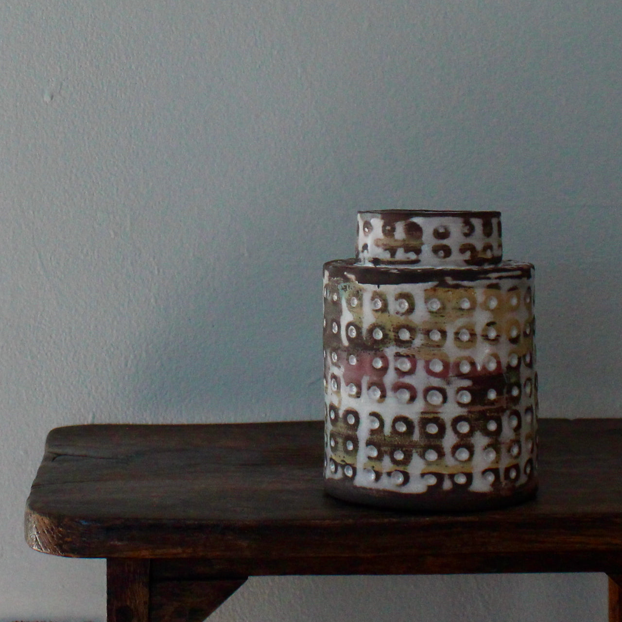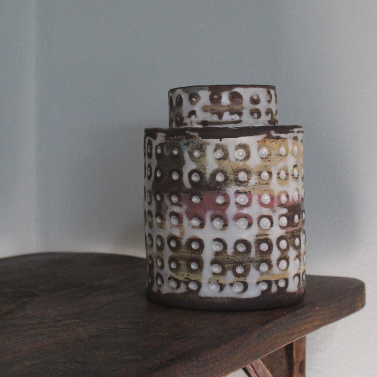 Elly’s ceramic vessels are hand built using slabs of clay with slips and textural marks and impressions applied during the making process. She works in a variety of stoneware clays, and is interested in how these clays transfer their unique qualities and characteristics to the work, allowing her to create groups and families of vessels, building a narrative between them.