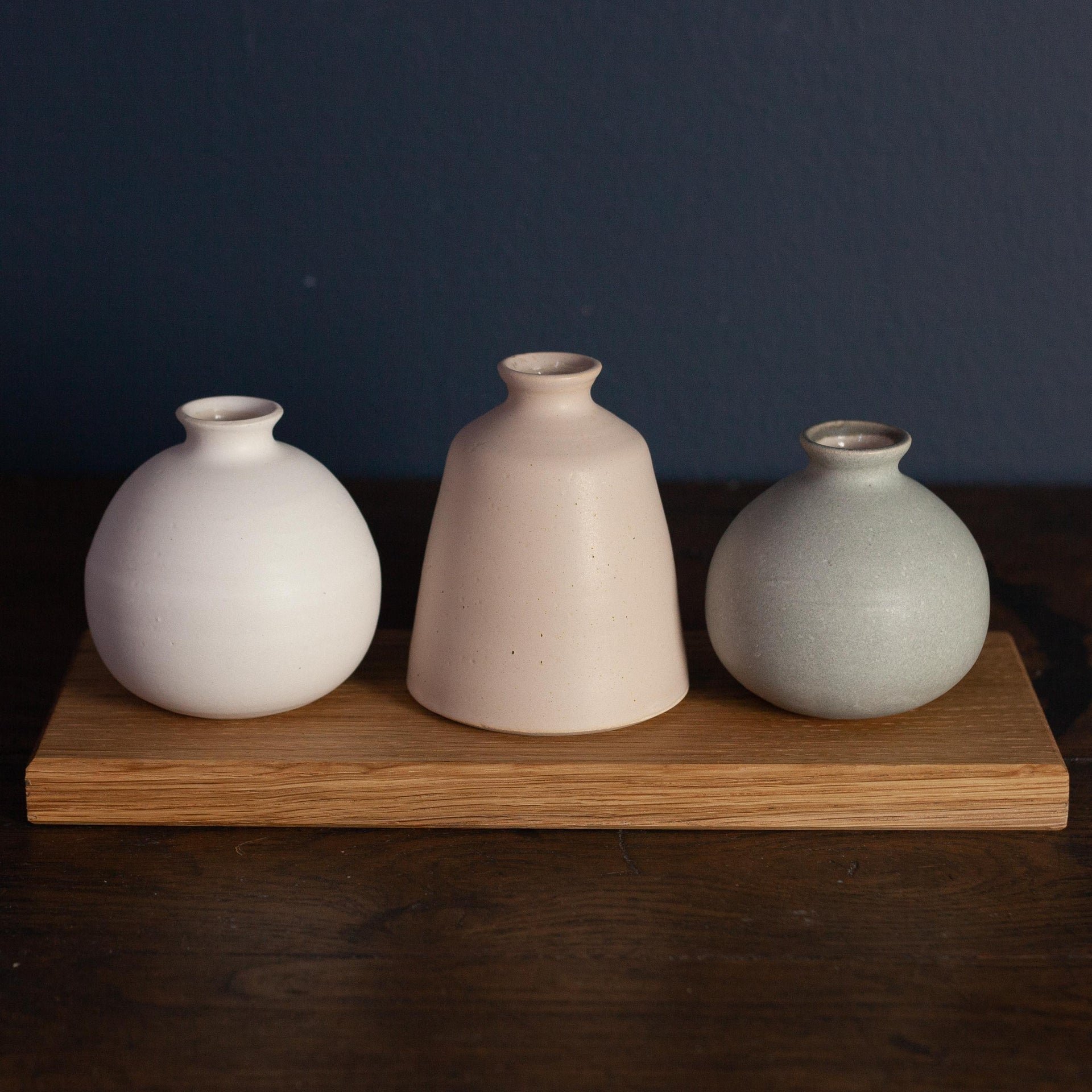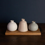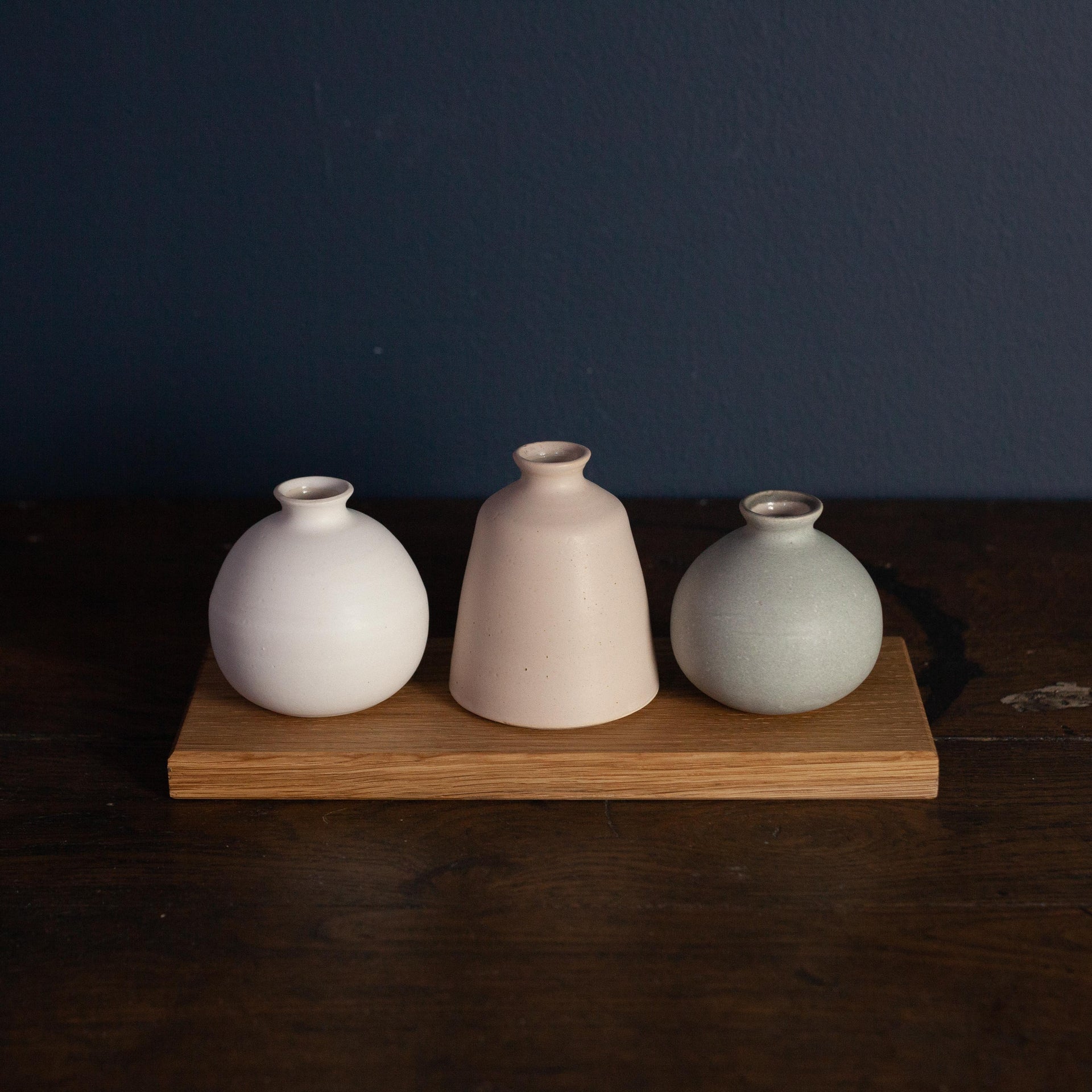 Wheel thrown ceramic bud vases, glazed on the interior with a glossy water-tight transparent glaze and on the exterior with Chalk white, Bisque pink and Pebble grey matte glazes. Oak board made by hand in Falmouth.