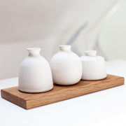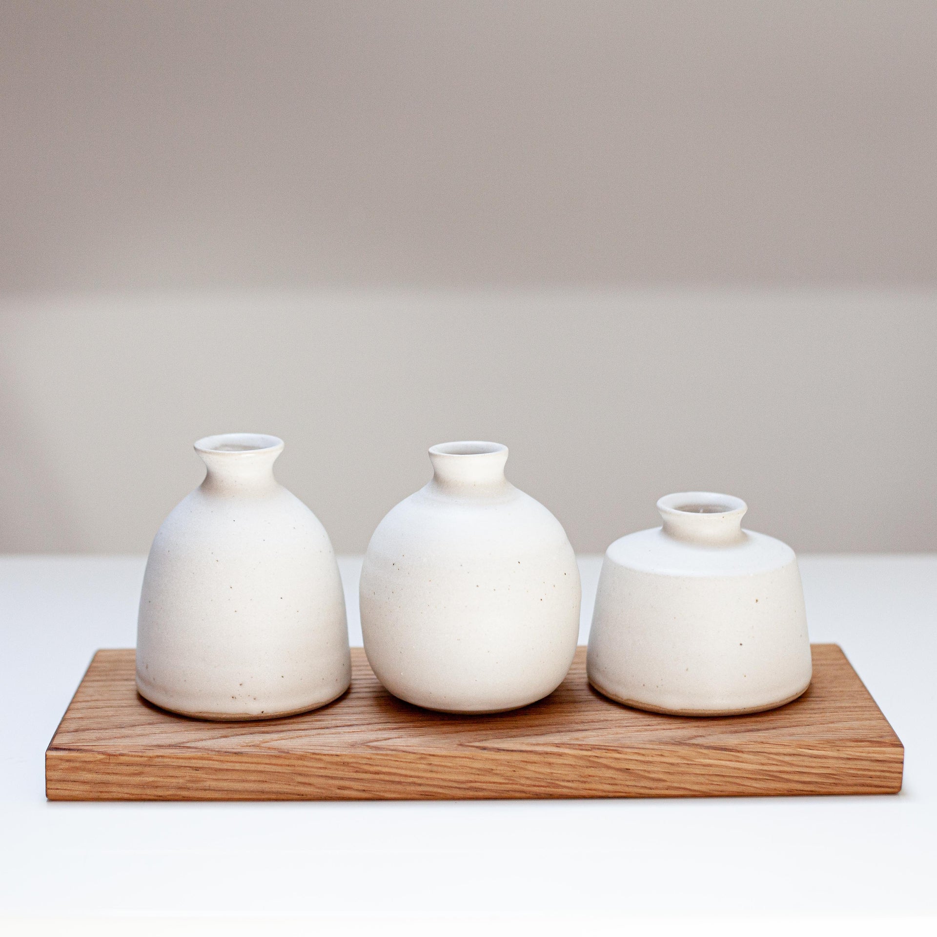 Wheel thrown ceramic bud vases, glazed on the interior with a glossy water-tight transparent glaze and on the exterior with a Chalk white, matte glaze. Oak board made by hand in Falmouth.