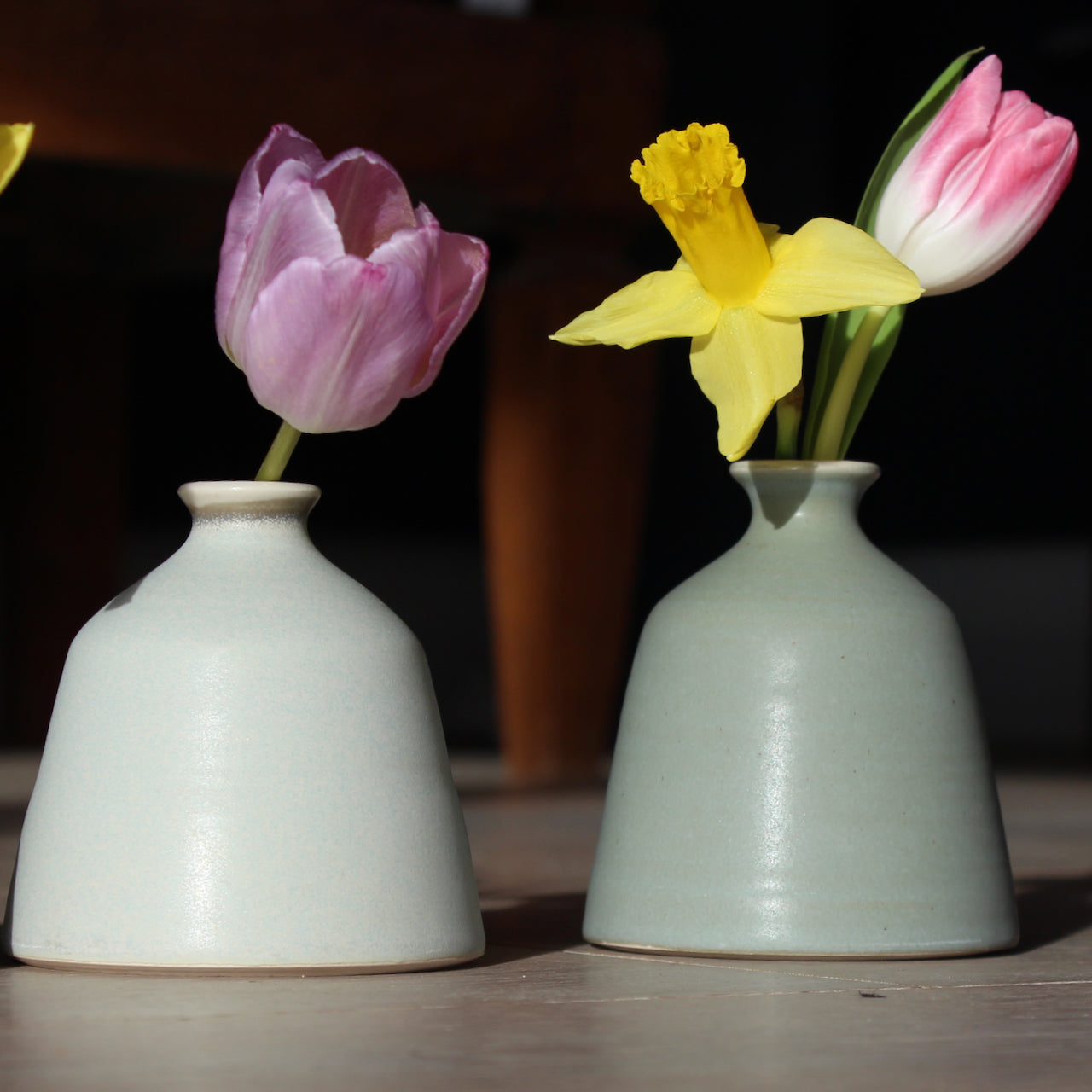 Wheel thrown ceramic bud vase using a white stoneware Cornish clay, glazed on the interior with a glossy water-tight transparent glaze and on the exterior with grey glaze.