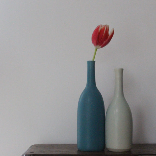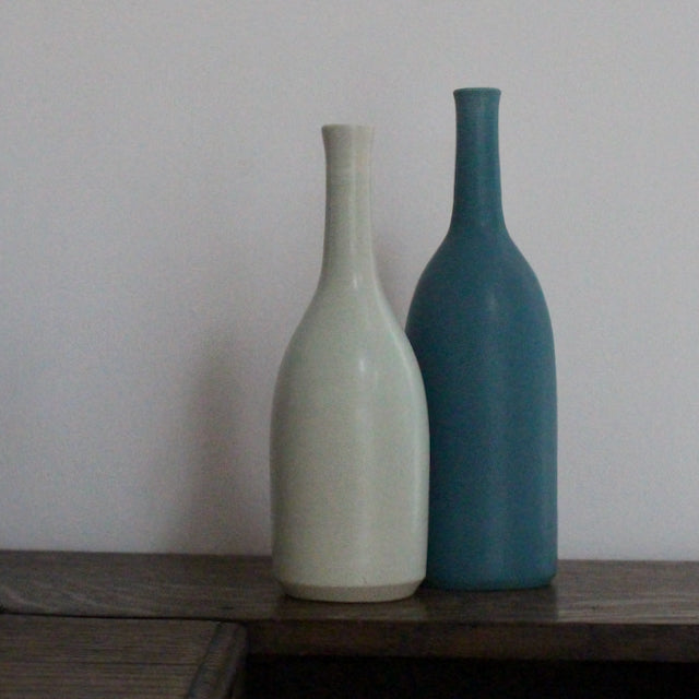 Lucy's vessels are thrown on the wheel using white earthenware clay. She has developed a semi-matt earthenware glaze, smooth to the touch, to which she adds oxides and stains to obtain a wide spectrum of colours. The interior glaze is watertight. Lucy Bottles look wonderful on their own, or for extra drama as part of a collection.