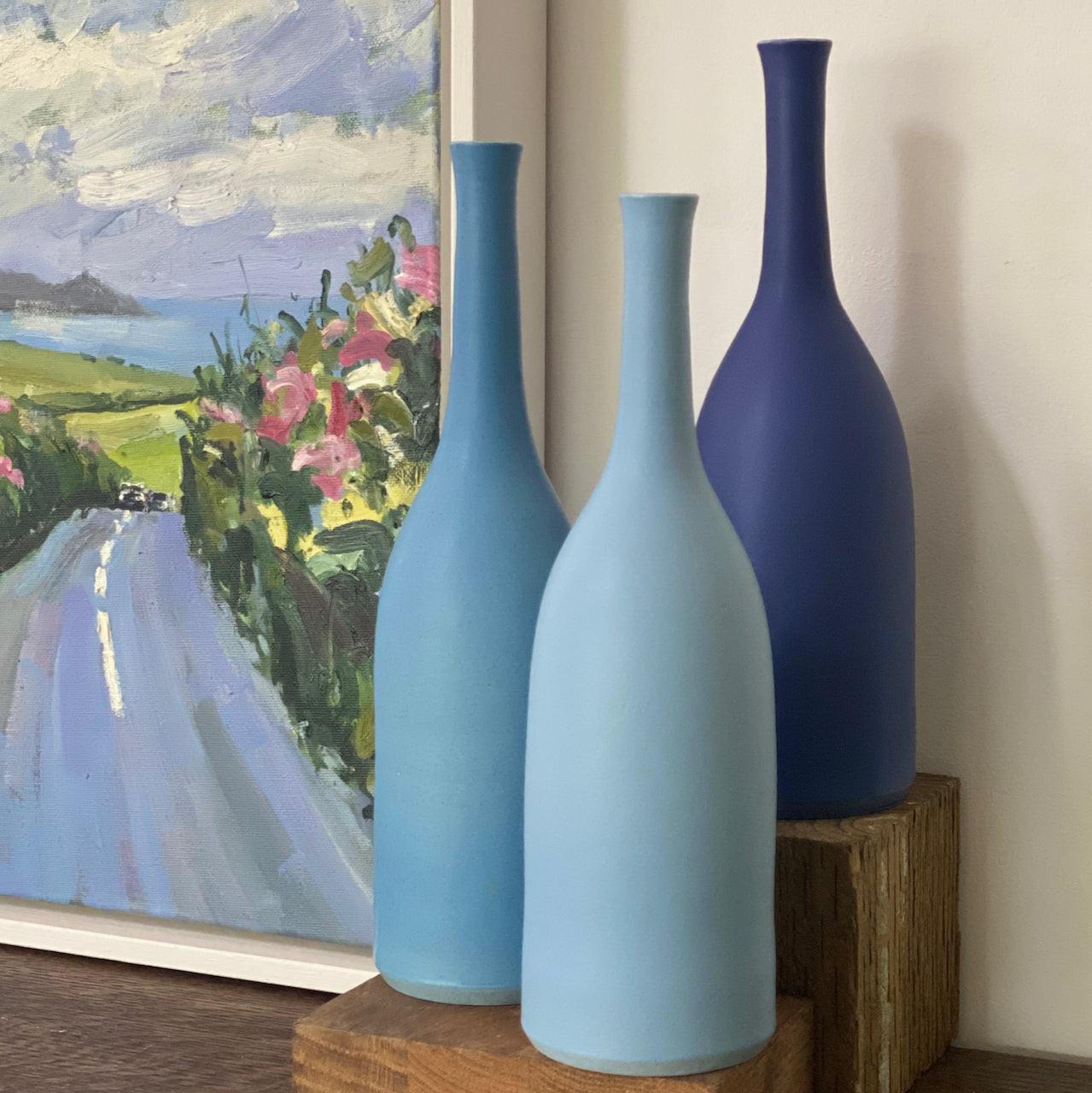 A collection of three of Lucy Burley's elegant and distinctive ceramic bottles in shades of blue: Sky Blue, 24cm; Azure Blue, 26cm and Ultramrine, 24cm.