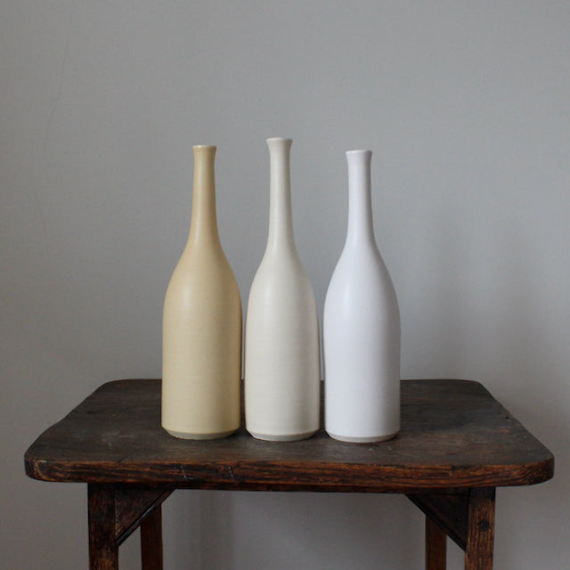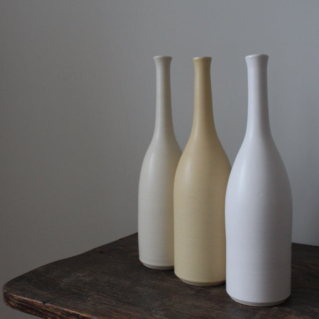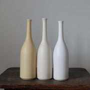 A collection of three of Lucy Burley's elegant and distinctive ceramic bottles in delicate neutral shades: Chalk White, 26cm; Ivory, 26cm and Parchment, 26cm.