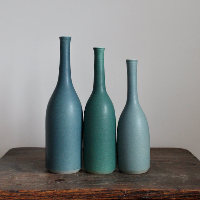 A collection of three of Lucy Burley's elegant and distinctive ceramic bottles in shades of teal: Deep teal, 26.5cm; Jade, 24cm and Teal, 22cm.