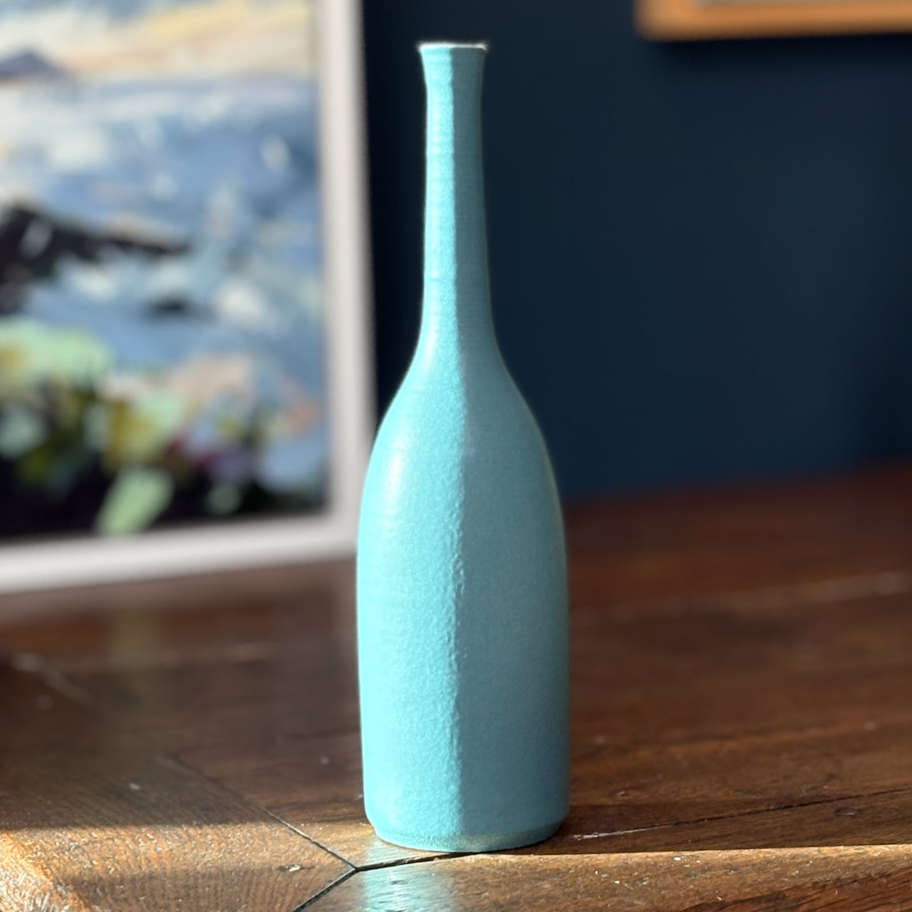 Lucy's vessels are thrown on the wheel using white earthenware clay. She has developed a semi-matt earthenware glaze, smooth to the touch, to which she adds oxides and stains to obtain a wide spectrum of colours. Her bottles and vessels look wonderful on their own - or as part of a collection. The interior glaze is watertight.
