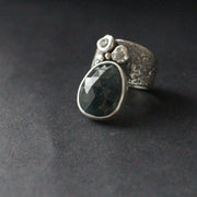 Carin Lindberg - Moss aquamarine and grey raw diamonds ring in textured silver