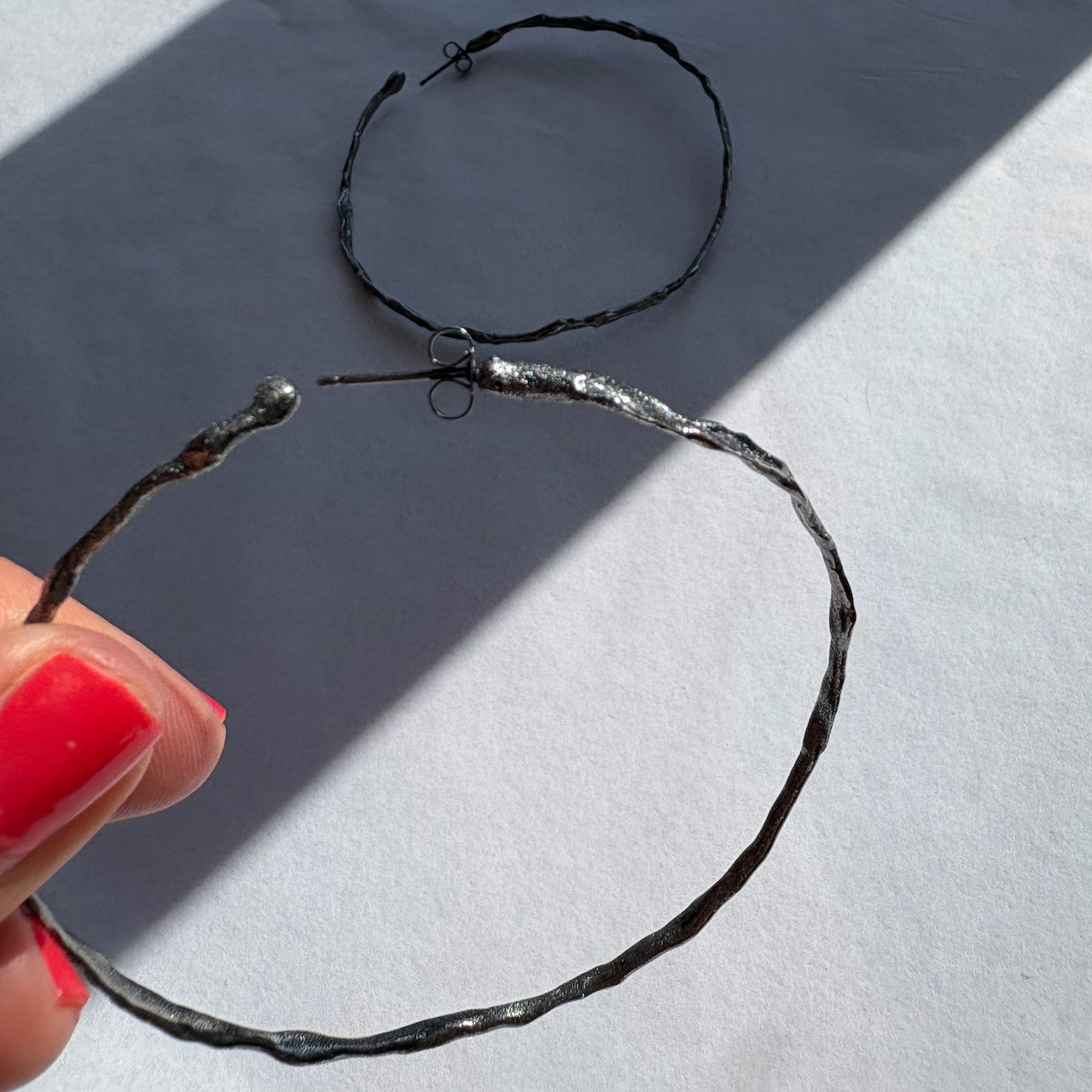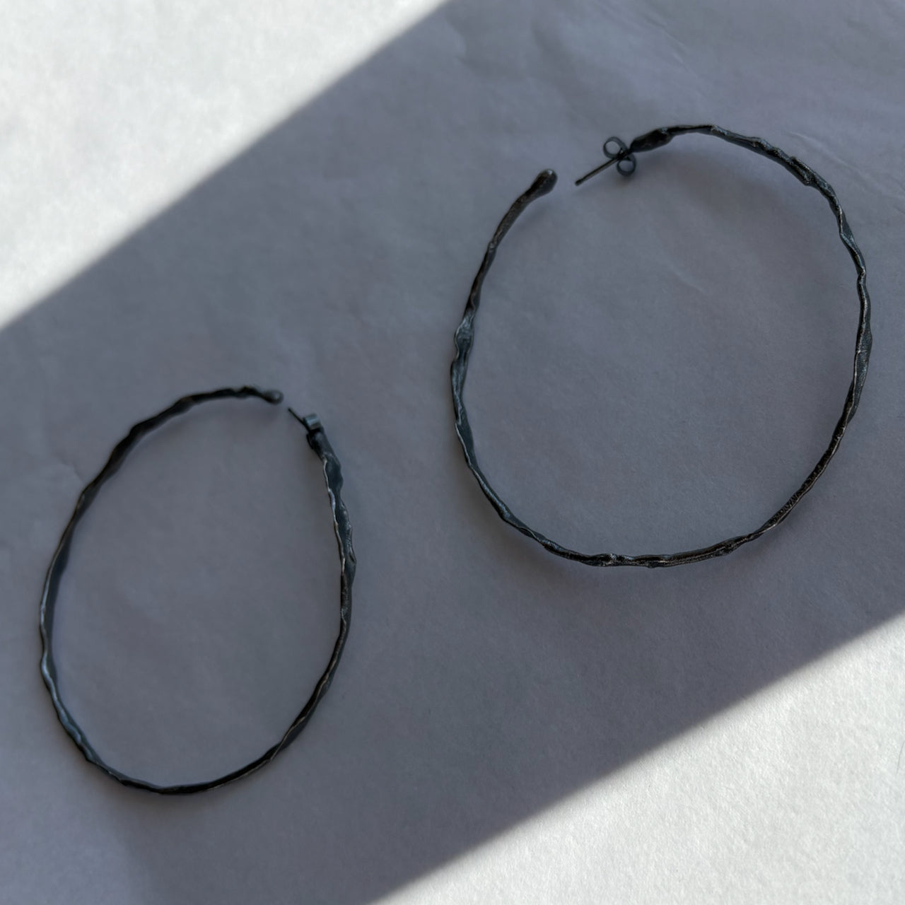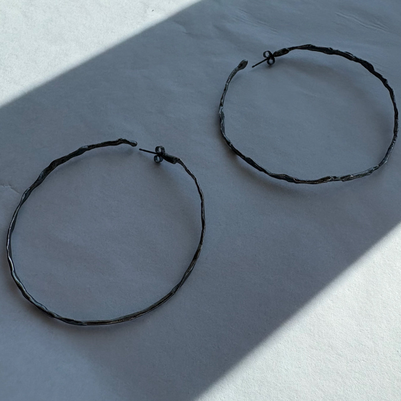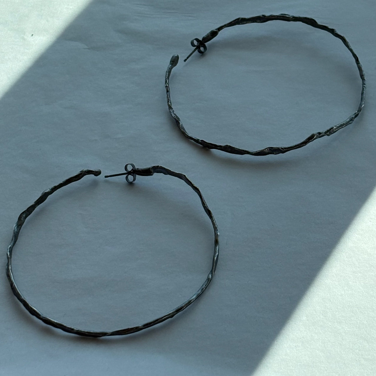 Organically hand sculpted silver Sea Siren hoop earrings with delicate hand created surface detail, and hand painted patina.