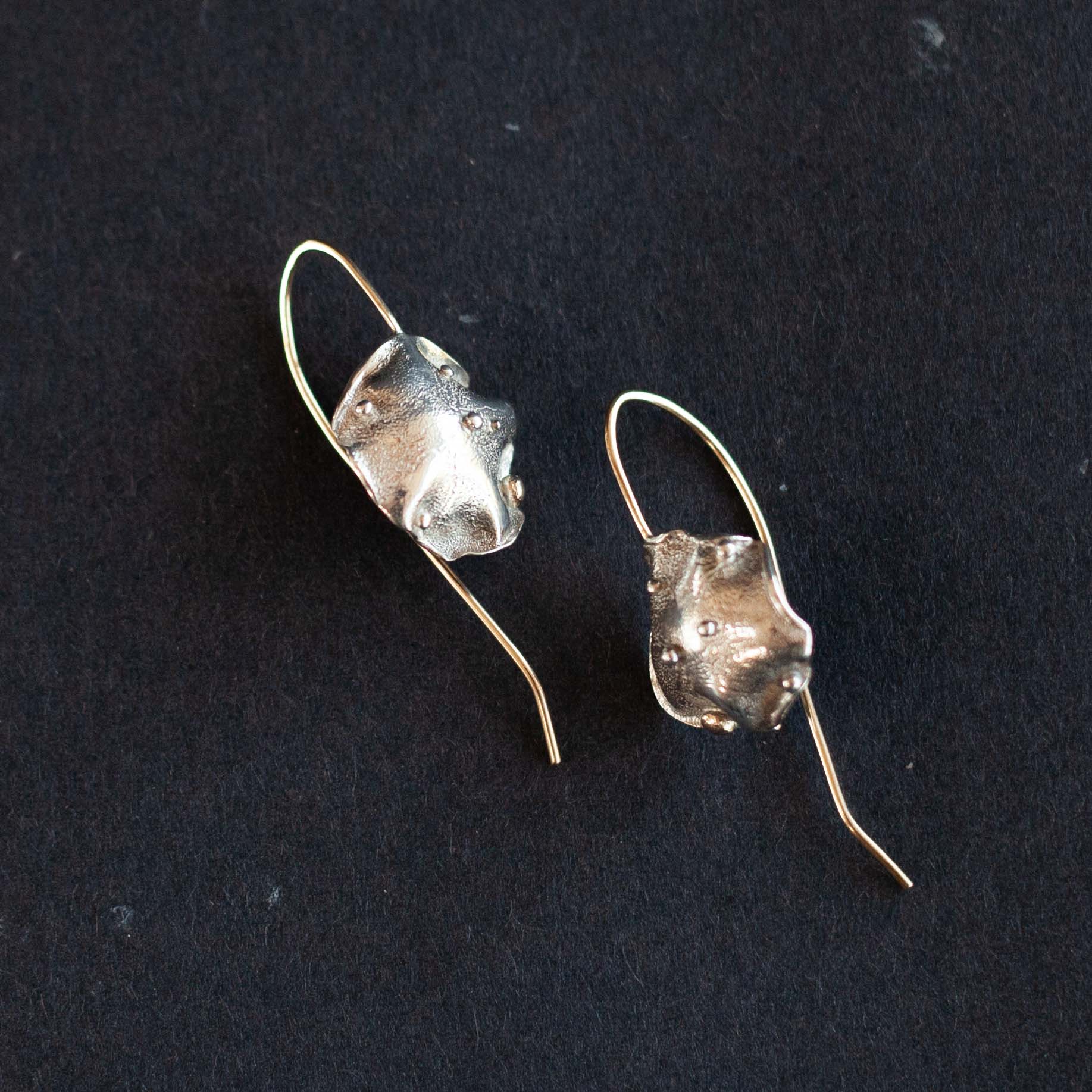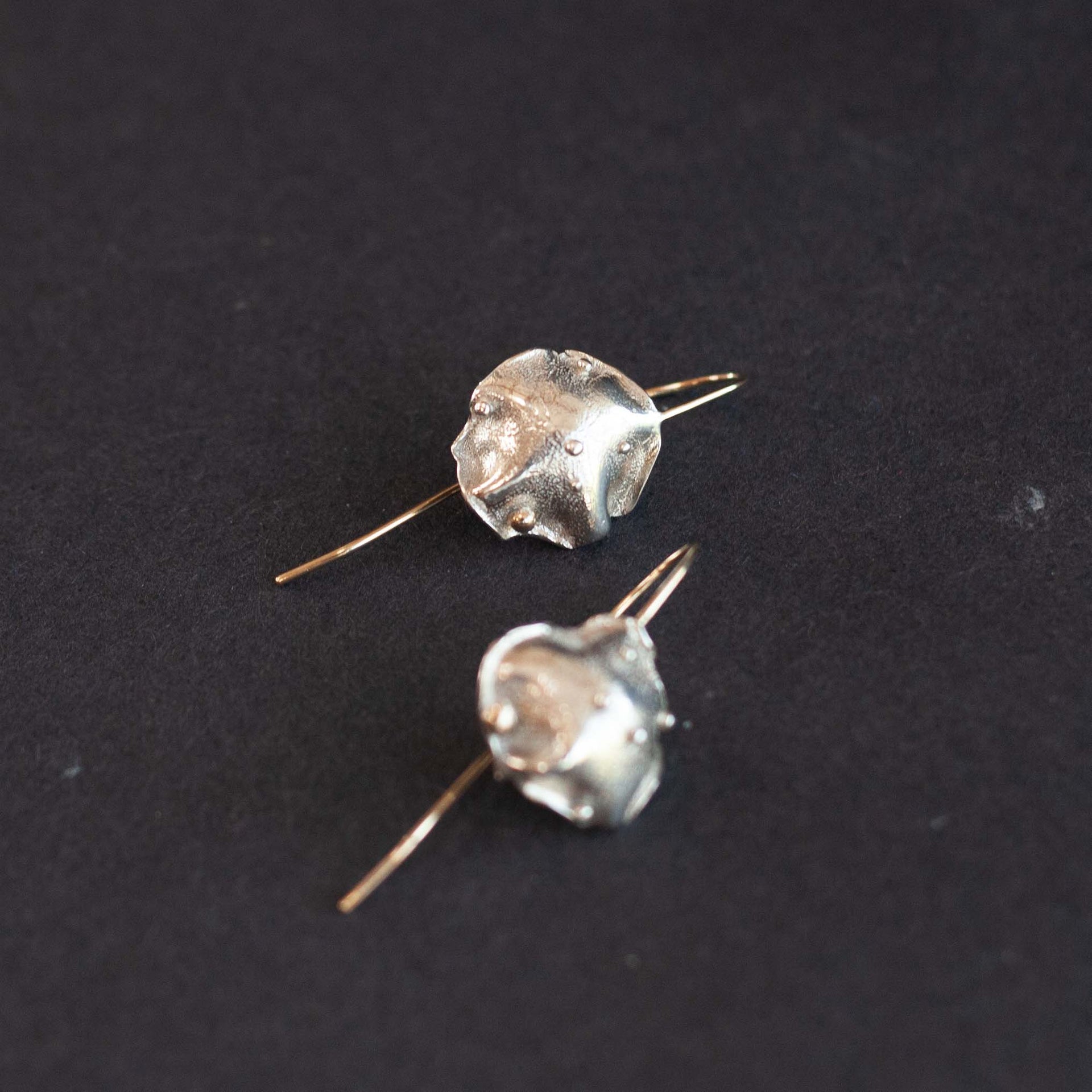 2.5cm. Silver Sea Siren earrings, handcrafted delicate surface detail with gold earring hooks.