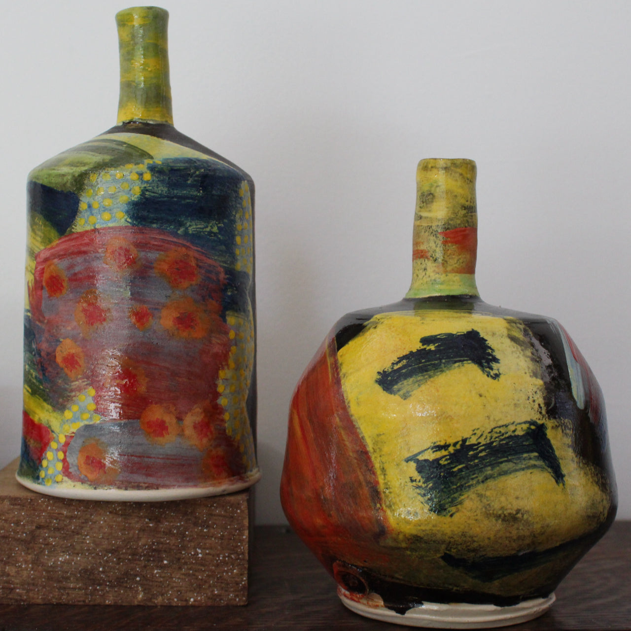 His work became more painterly and abstract, pots now becoming blank canvases; his interest in Zen calligraphy and the use of the Zen brush directed him to his present spontaneous way of working, painting a pot rather than decorating one. In early 2020, Pollex embarked on another change: brushing the glaze mostly off the outside of pots leaving the occasional splash of glaze here and there. The unglazed colours and brushstrokes are now are far more subtle and defined than under a glaze covering.