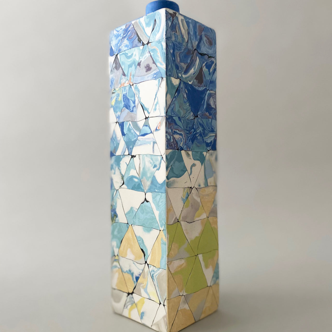Judy's porcelain vessel has been made entirely by hand using the Japanese technique of Nerikomi - a process which joins together many small individually patterned pieces to form a whole. The porcelain has been coloured using oxides and ceramic stains. After firing the surface is then polished with diamond pads to achieve the tactile sheen. Should any small cracks have appeared in firing, another Japanese technique - Kintsugi, repairing with silver - is employed.