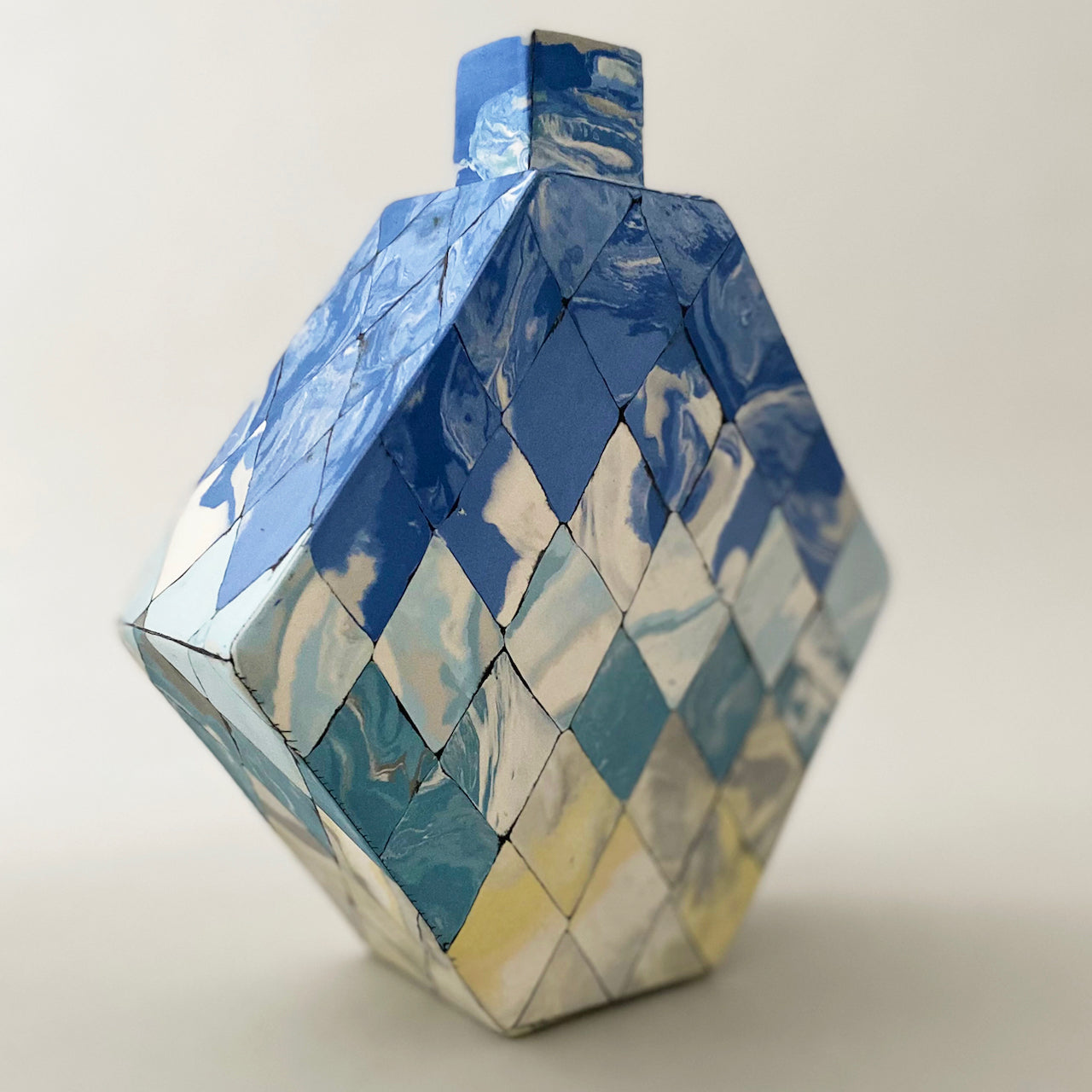 Judy's porcelain vessel has been made entirely by hand using the Japanese technique of Nerikomi - a process which joins together many small individually patterned pieces to form a whole. The porcelain has been coloured using oxides and ceramic stains. After firing the surface is then polished with diamond pads to achieve the tactile sheen. Should any small cracks have appeared in firing, another Japanese technique - Kintsugi, repairing with silver - is employed.