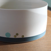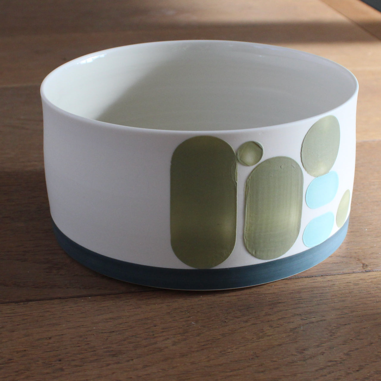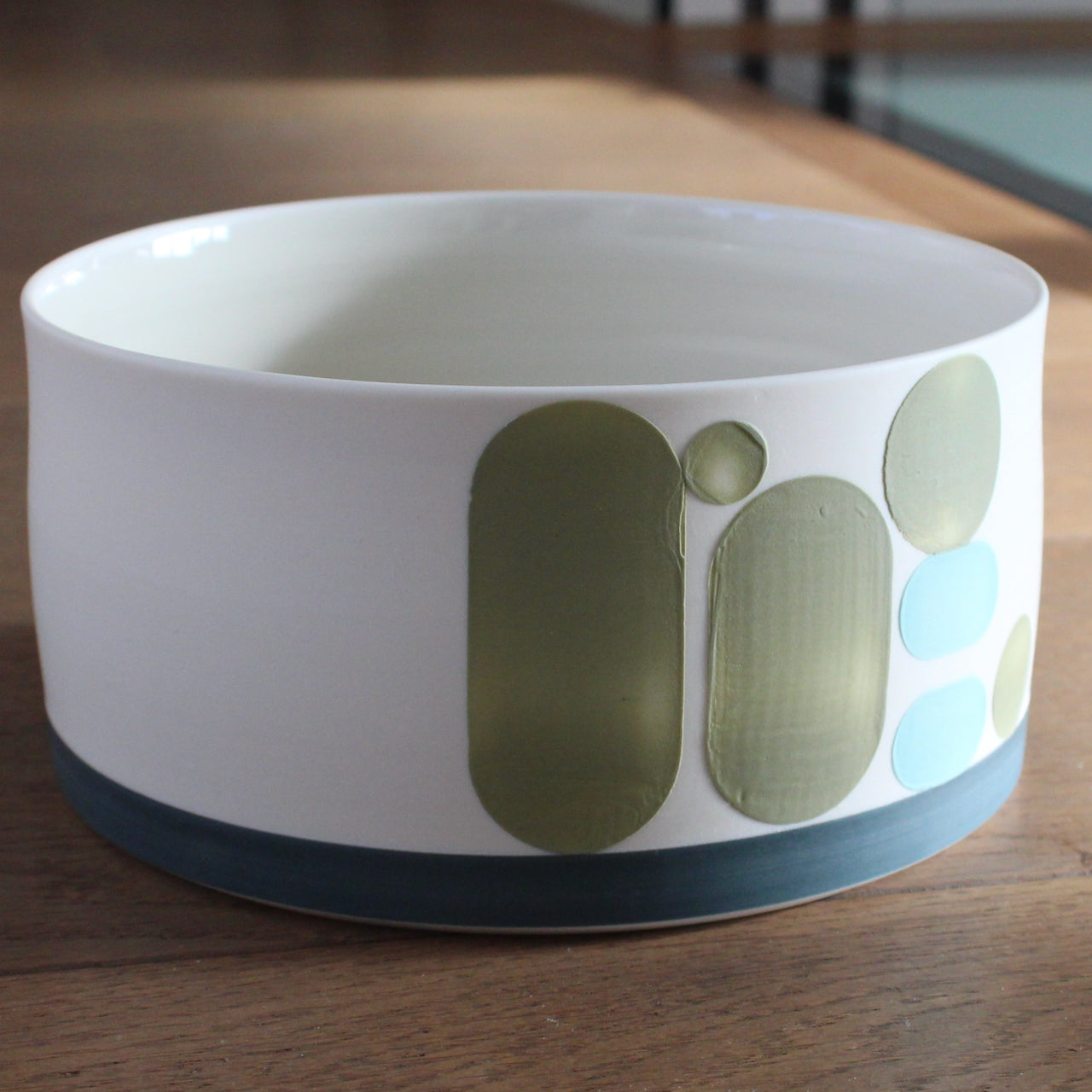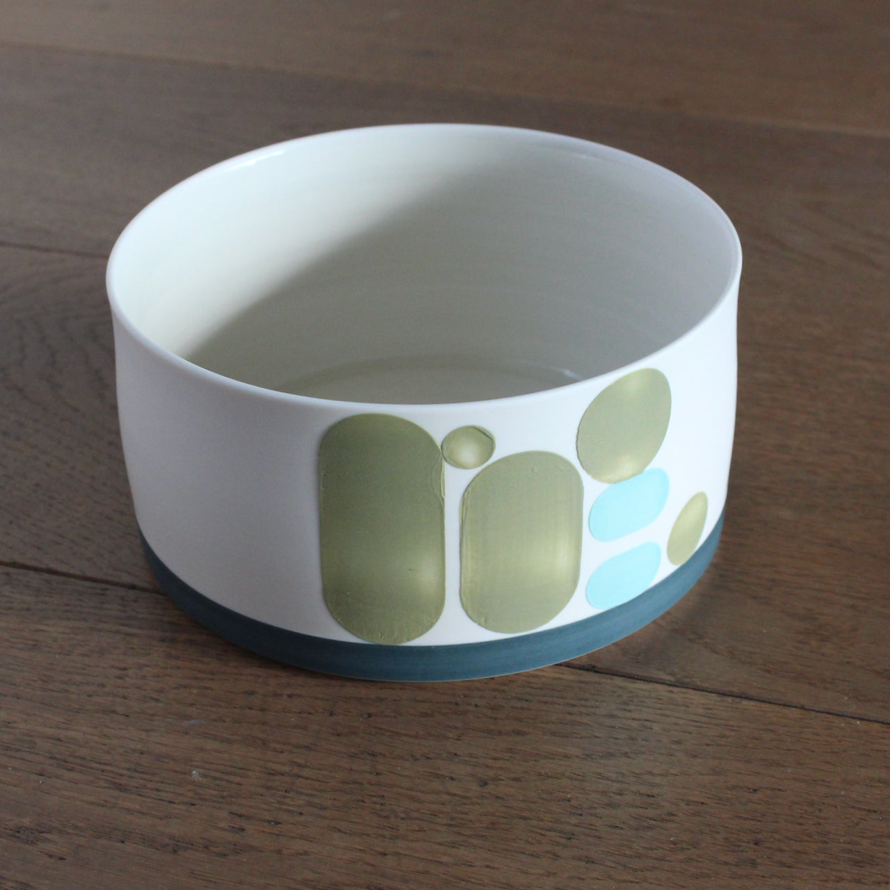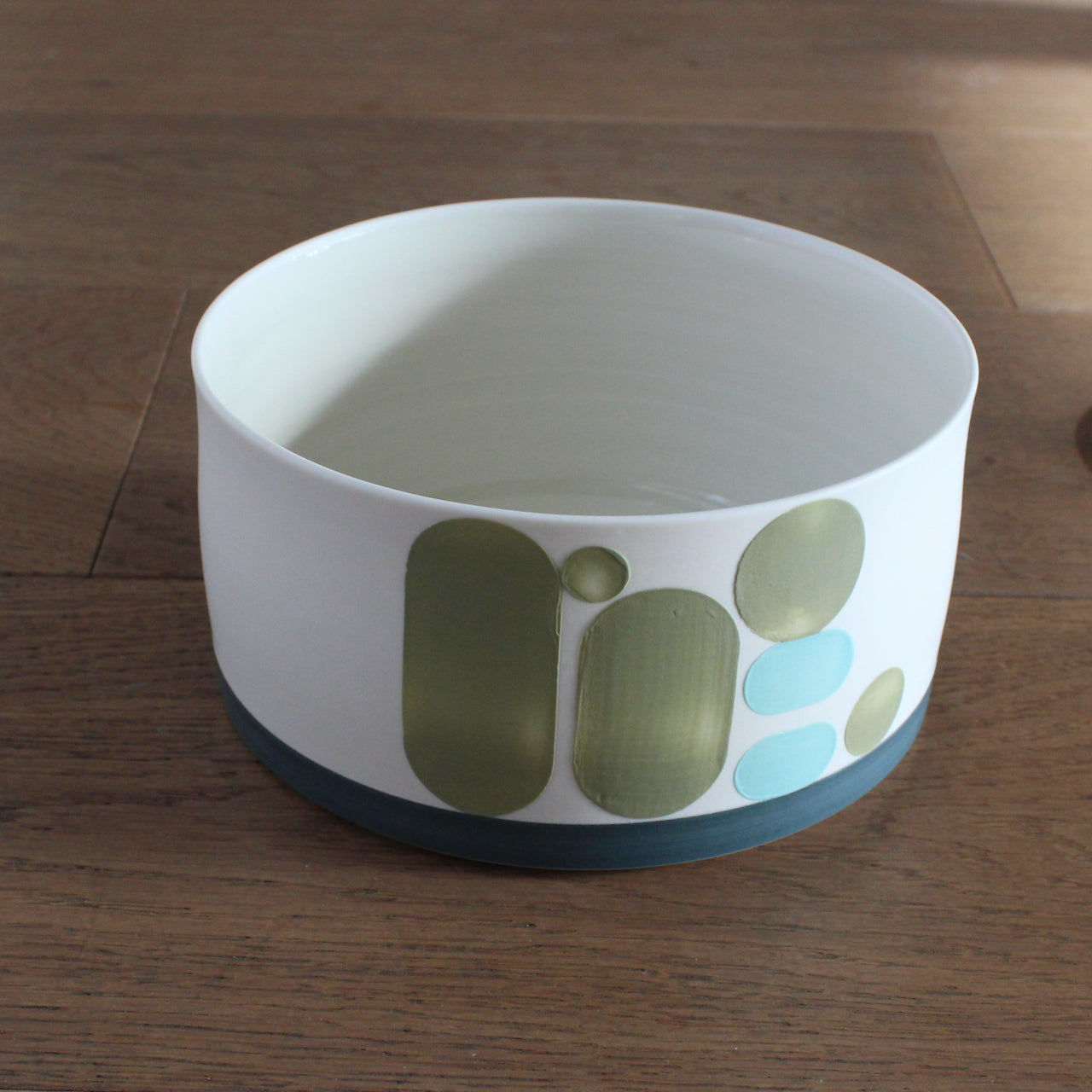 Kathryn Sherriff,  By the Line Pottery, makes functional, wheel thrown porcelain ceramics in small batches from her garden studio in Carshalton, Surrey. She aims for simple designs with clean lines and muted colour palettes that are practical and will work in most homes and on any dining table.  The exterior surfaces are often left unglazed to create a tactile contrast between the raw clay and the glazed surfaces. Decoration is applied using coloured slips, inlaid lines and carved repeating patterns