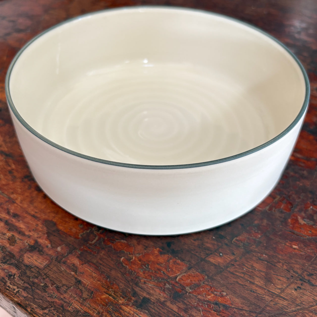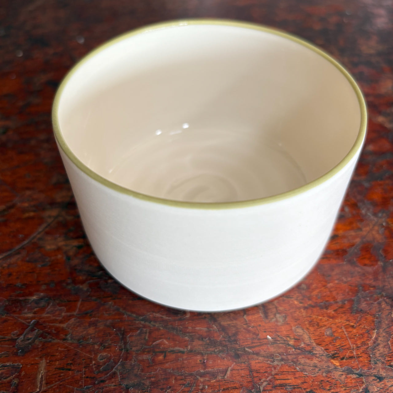 Kathryn Sherriff, By the Line Pottery, makes functional, wheel thrown porcelain ceramics in small batches from her garden studio in Carshalton, Surrey. She aims for simple designs with clean lines and muted colour palettes that are practical and will work in most homes and on any dining table. The exterior surfaces are often left unglazed to create a tactile contrast between the raw clay and the glazed surfaces. Decoration is applied using coloured slips, inlaid lines and carved repeating patterns