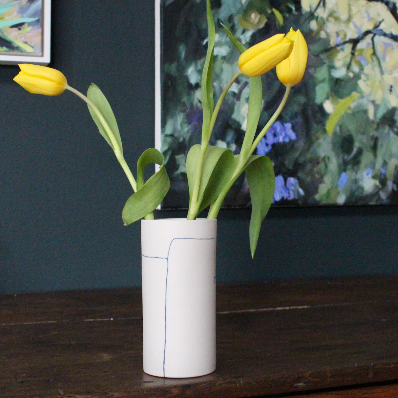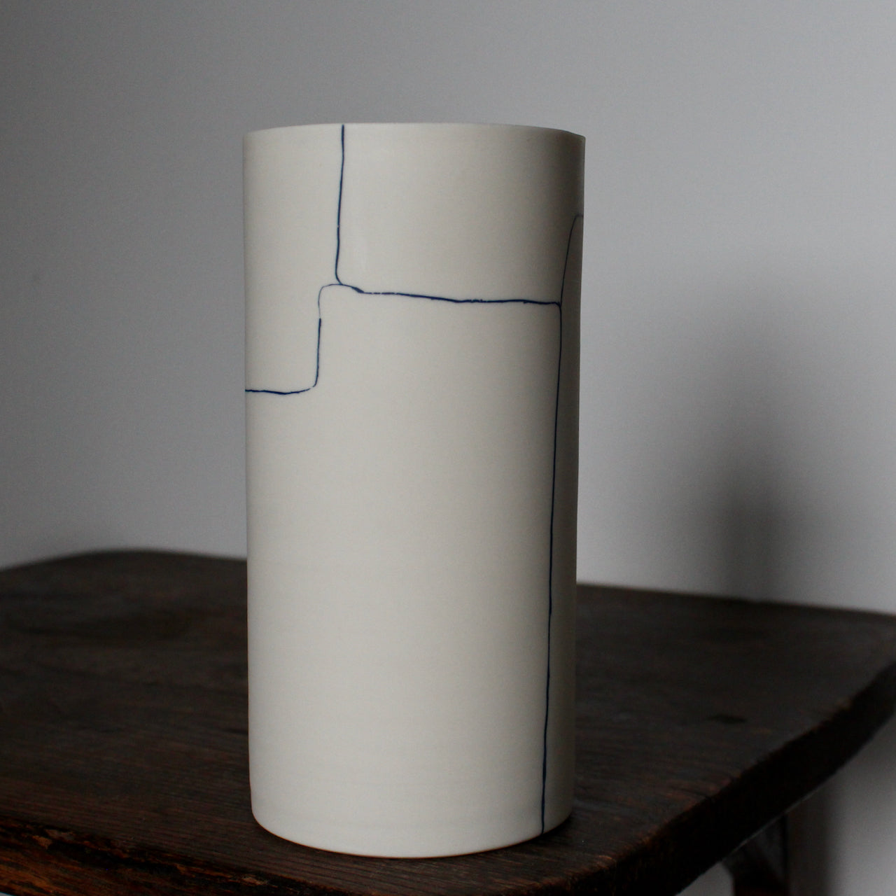 Liz O’Dwyer makes wheel thrown ceramics in porcelain and each piece is bespoke and handcrafted. Her aim is to create functional and sculptural vessels with modern, clean crisp lines. The purity of the colour allows the simplicity of the form to stand out and creates a strong contrast for the lines that cut through the surface. Liz’s love of drawing and mark making features on the individual pieces and is produced using slip inlay. The form of each vessel becomes the blank canvas for her drawings inspired by the walks she takes and the maps she follows.