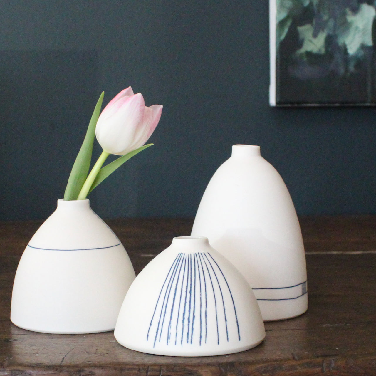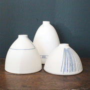 Liz O’Dwyer makes wheel thrown ceramics in porcelain and each piece is bespoke and handcrafted. Her aim is to create functional and sculptural vessels with modern, clean crisp lines. The purity of the colour allows the simplicity of the form to stand out and creates a strong contrast for the lines that cut through the surface. Liz’s love of drawing and mark making features on the individual pieces and is produced using slip inlay. The form of each vessel becomes the blank canvas for her drawings inspired by the walks she takes and the maps she follows.