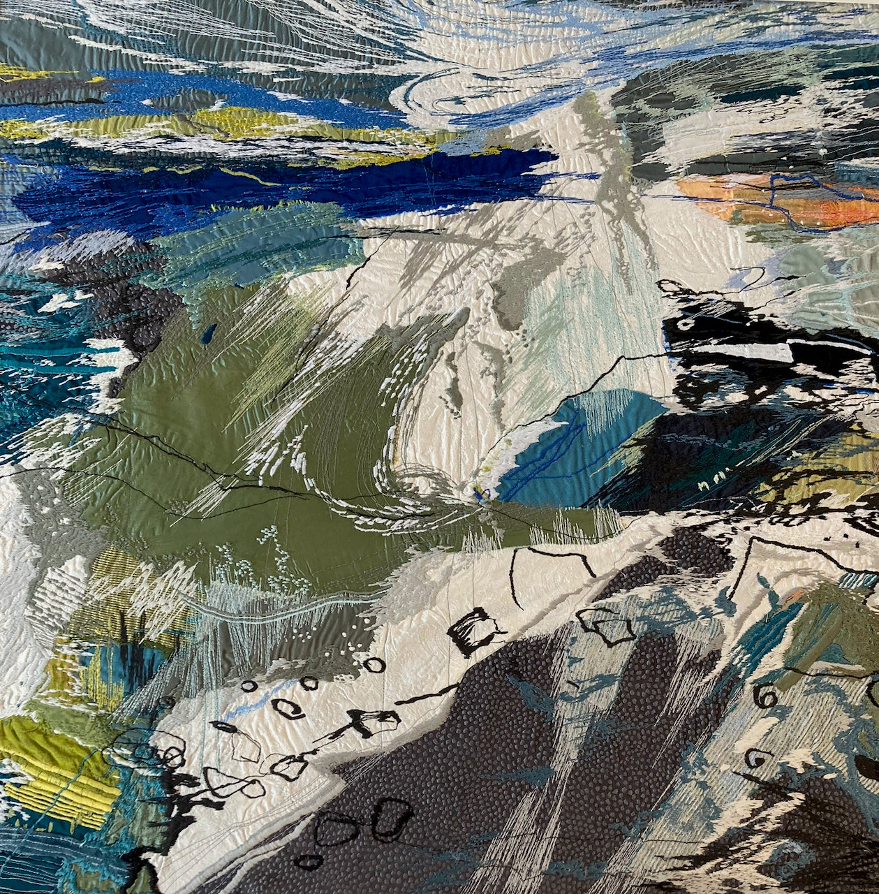 Observing the colours, patterns and textures of the land and recording these emotions as expressive paintings is the starting point for all Sarah’s energetic embroideries. The first layers of these textile works are the result of a selection process of an artist’s eye, choosing fabrics that start to tell a story; often a snippet of a sari from a friend or the sleeve of a velvet shirt from her sister. The fun begins here with her trusted sewing machine and free-motion embroidery using loose expressive marks to build up layers that take the viewer on a journey over the surface of the work. The incidental distortions of the fabrics are all part of of the resulting rich textures. Combining velvets and shot-silks with matt and lustrous threads are her tools to develop dynamic layers and balance.