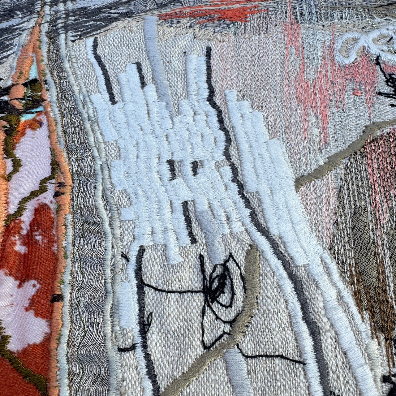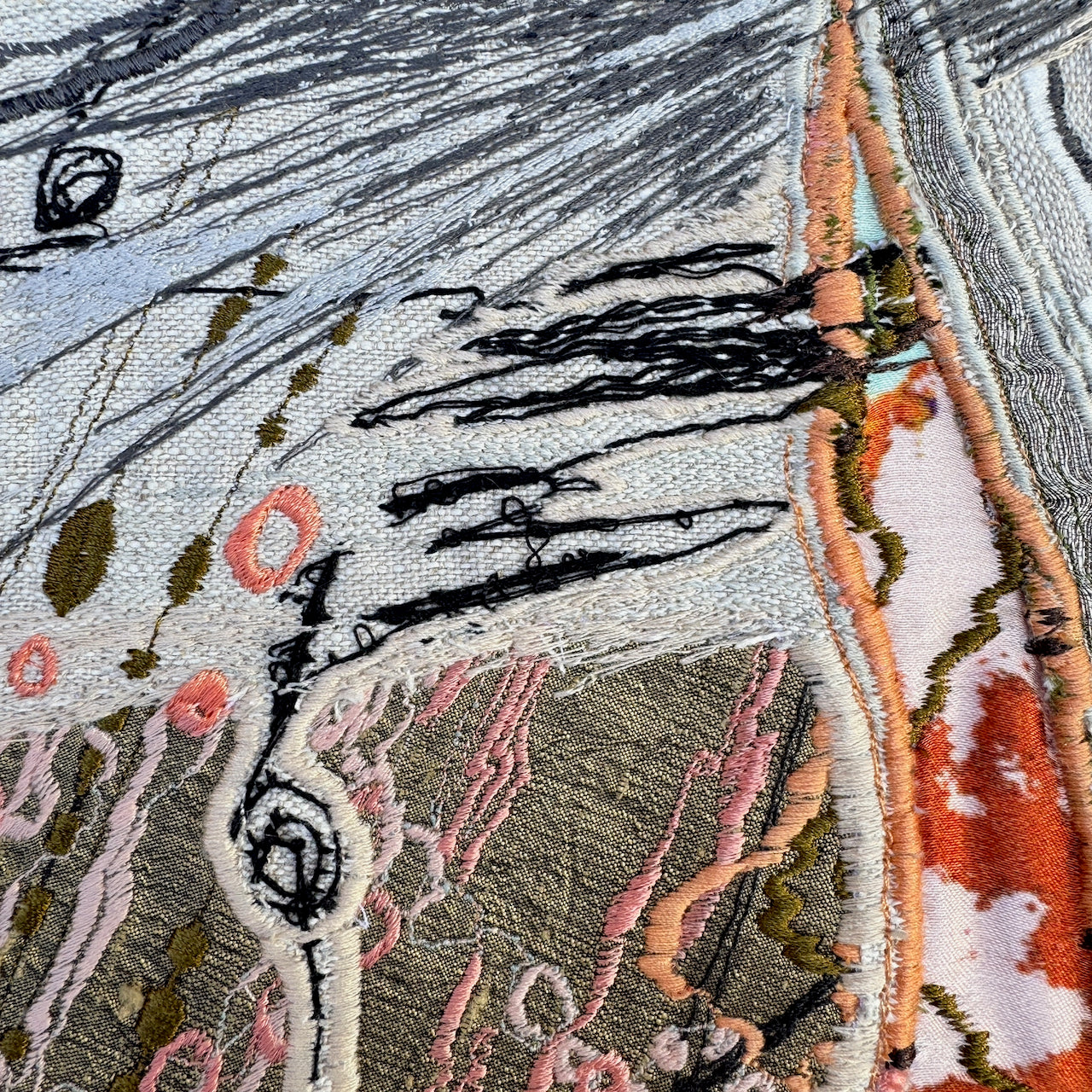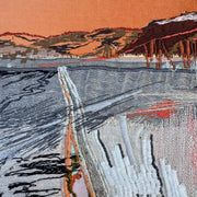 Observing the colours, patterns and textures of the land and recording these emotions as expressive paintings is the starting point for all Sarah’s energetic embroideries. The first layers of these textile works are the result of a selection process of an artist’s eye, choosing fabrics that start to tell a story; often a snippet of a sari from a friend or the sleeve of a velvet shirt from her sister. The fun begins here with her trusted sewing machine and free-motion embroidery using loose expressive marks to build up layers that take the viewer on a journey over the surface of the work. The incidental distortions of the fabrics are all part of of the resulting rich textures. Combining velvets and shot-silks with matt and lustrous threads are her tools to develop dynamic layers and balance.