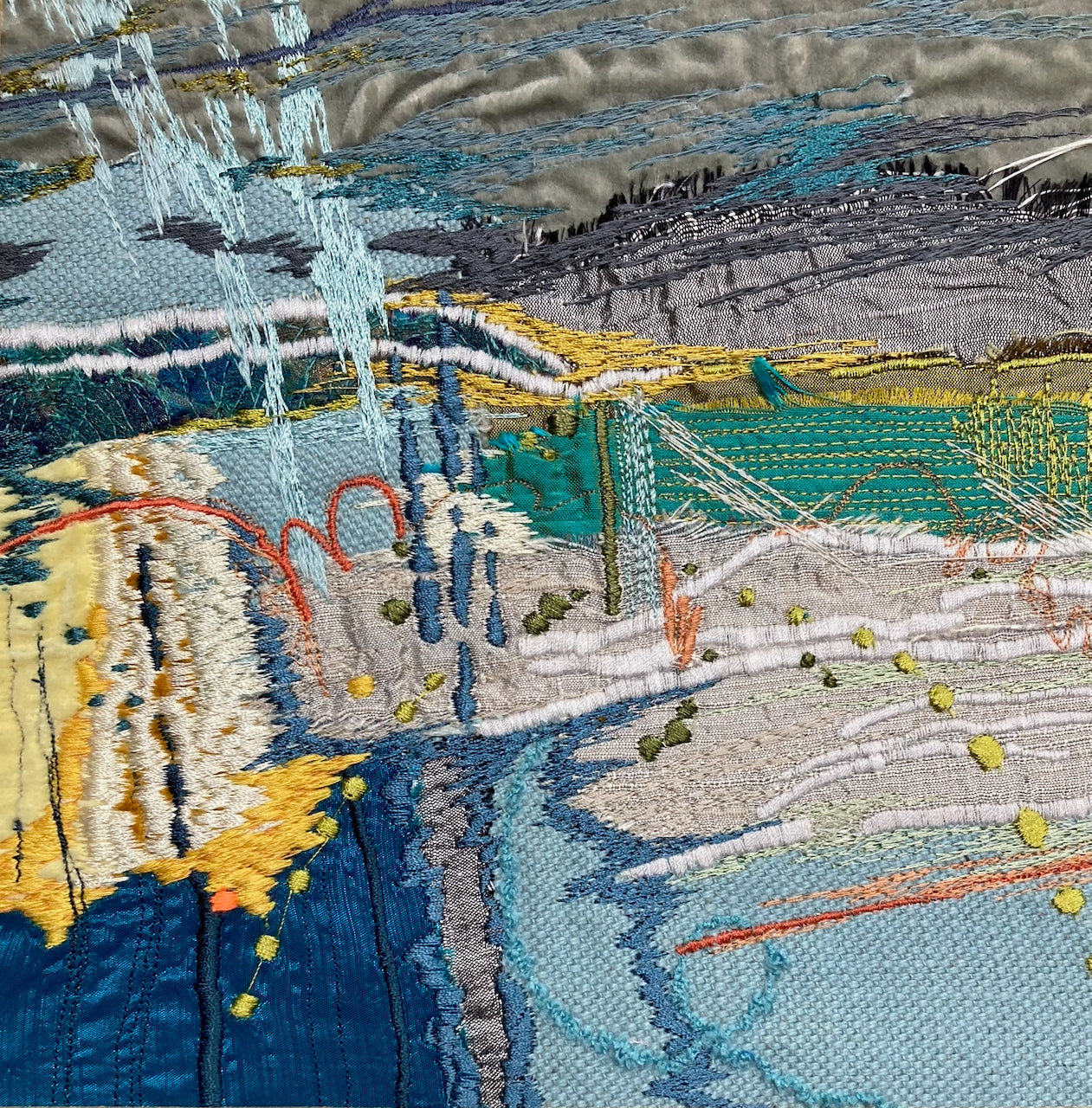 Observing the colours, patterns and textures of the land and recording these emotions as expressive paintings is the starting point for all Sarah’s energetic embroideries. The first layers of these textile works are the result of a selection process of an artist’s eye, choosing fabrics that start to tell a story; often a snippet of a sari from a friend or the sleeve of a velvet shirt from her sister. The fun begins here with her trusted sewing machine and free-motion embroidery using loose expressive marks to build up layers that take the viewer on a journey over the surface of the work. The incidental distortions of the fabrics are all part of of the resulting rich textures. Combining velvets and shot-silks with matt and lustrous threads are her tools to develop dynamic layers and balance.
