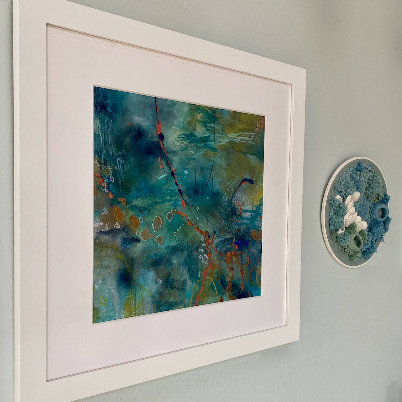 Each artist has her individual creative practice. There is a shared love of colour and expressive mark making – in paint or ink, stitch or print. A fascination with surface, and close-up details of colour, shape, line and texture are evident in both artist’s work.