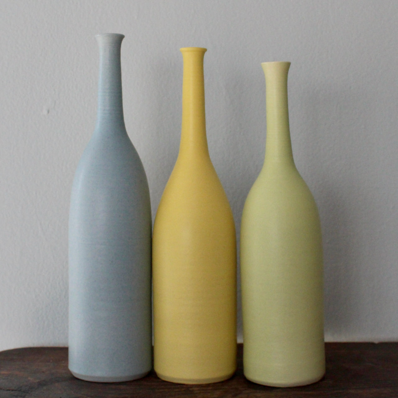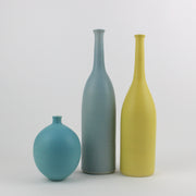 Lucy's vessels are thrown on the wheel using white earthenware clay. She has developed a semi-matt earthenware glaze, smooth to the touch, to which she adds oxides and stains to obtain a wide spectrum of colours. The interior glaze is watertight.