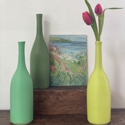 A collection of three of Lucy Burley's elegant and distinctive ceramic bottles in shades of green: Pistachio, 24cm; Peppermint, 24cm and Olive, 22cm.
