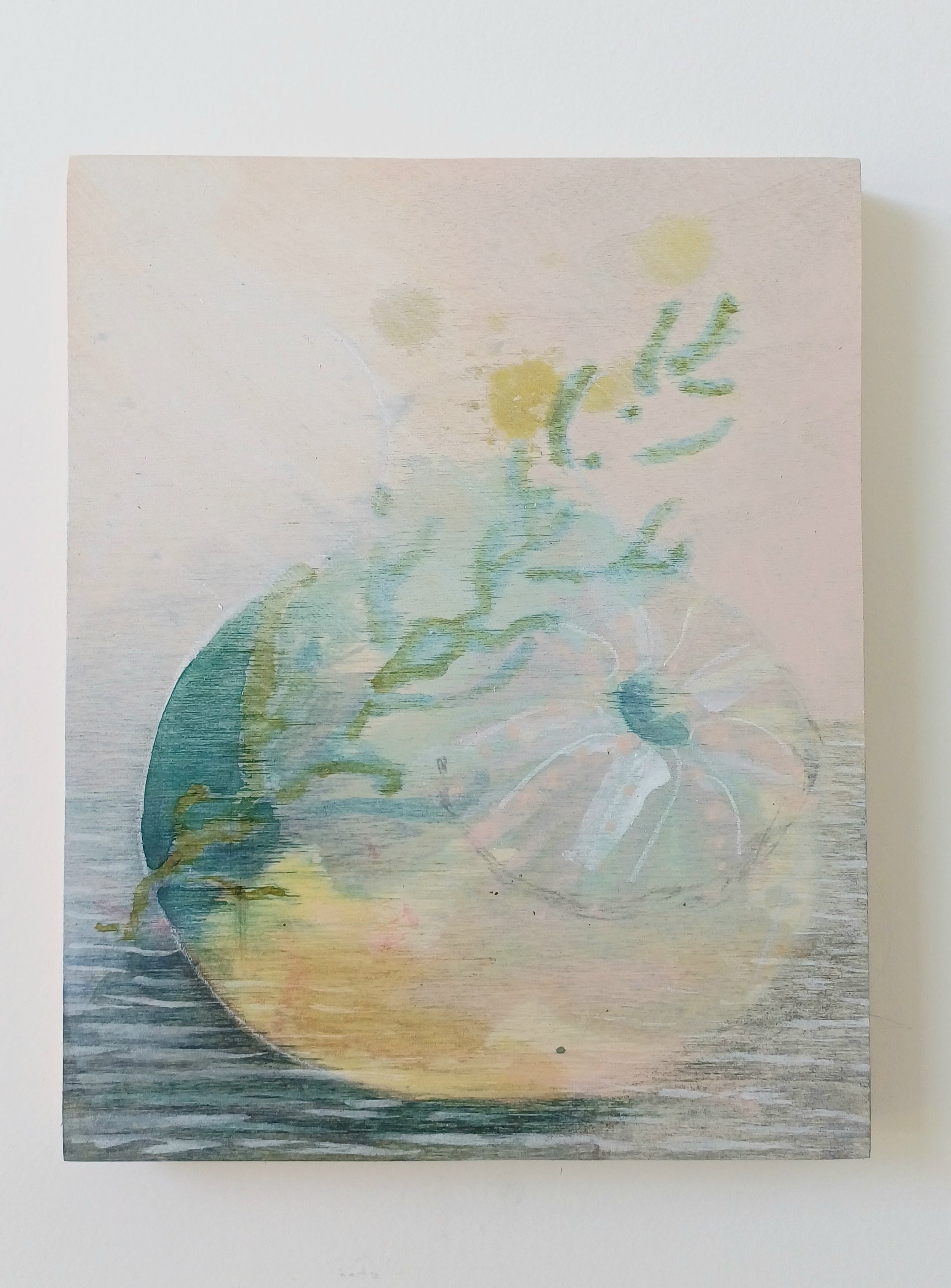 Originally from London, Tara Leaver is an artist and teacher living by the sea in Cornwall, UK. Tara is happiest near - or preferably in - the sea, where she swims as often as she can. She immerses herself in the multi-sensory experience of it, taking photos underwater, looking and feeling into the abundance of life above and below the waves. Back in the studio, she weaves together elements from the photos, memories, and gathered seaweed, to distill those experiences into paintings.
