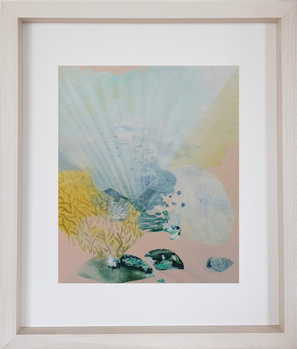 Originally from London, Tara Leaver is an artist and teacher living by the sea in Cornwall, UK. Tara is happiest near - or preferably in - the sea, where she swims as often as she can. She immerses herself in the multi-sensory experience of it, taking photos underwater, looking and feeling into the abundance of life above and below the waves. Back in the studio, she weaves together elements from the photos, memories, and gathered seaweed, to distill those experiences into paintings.