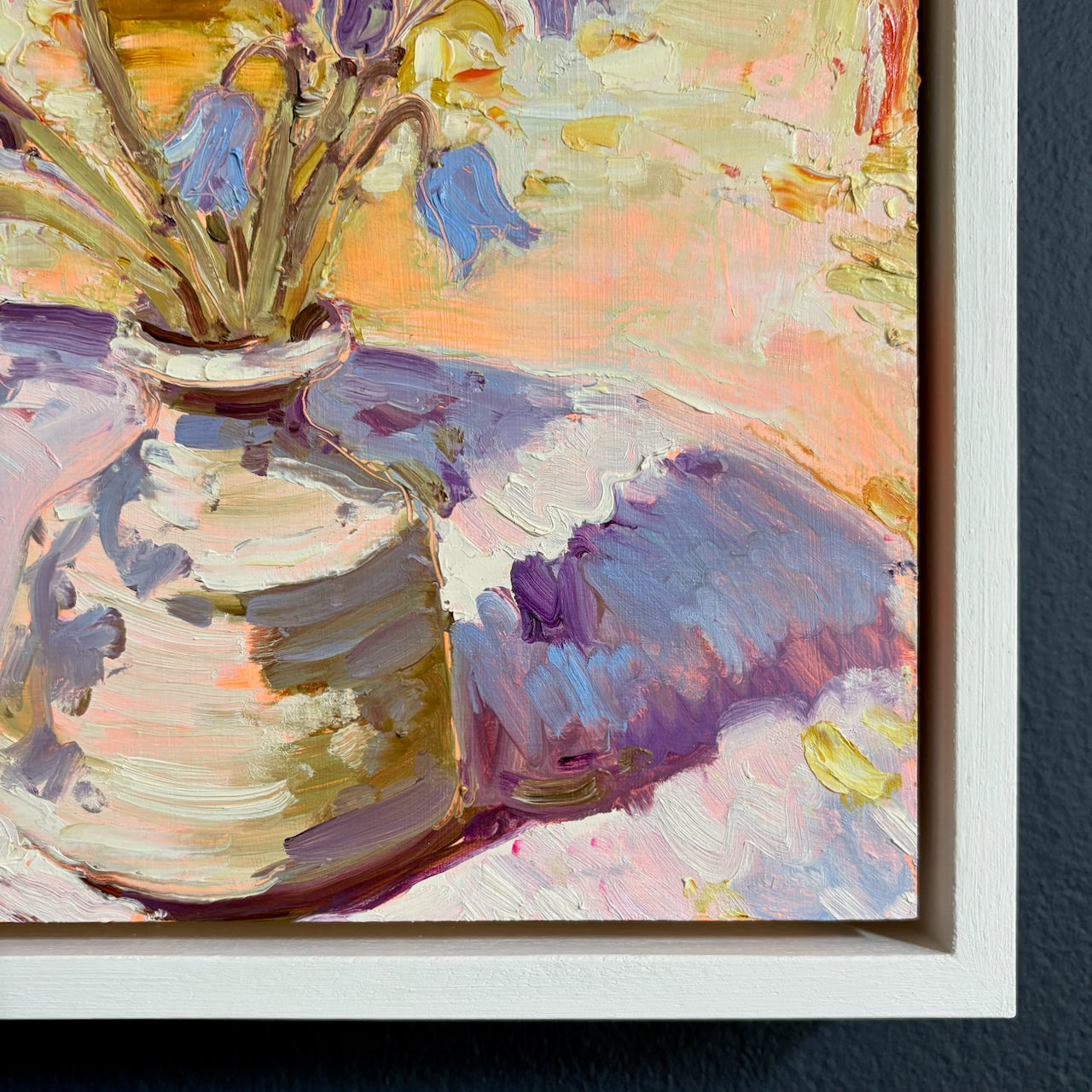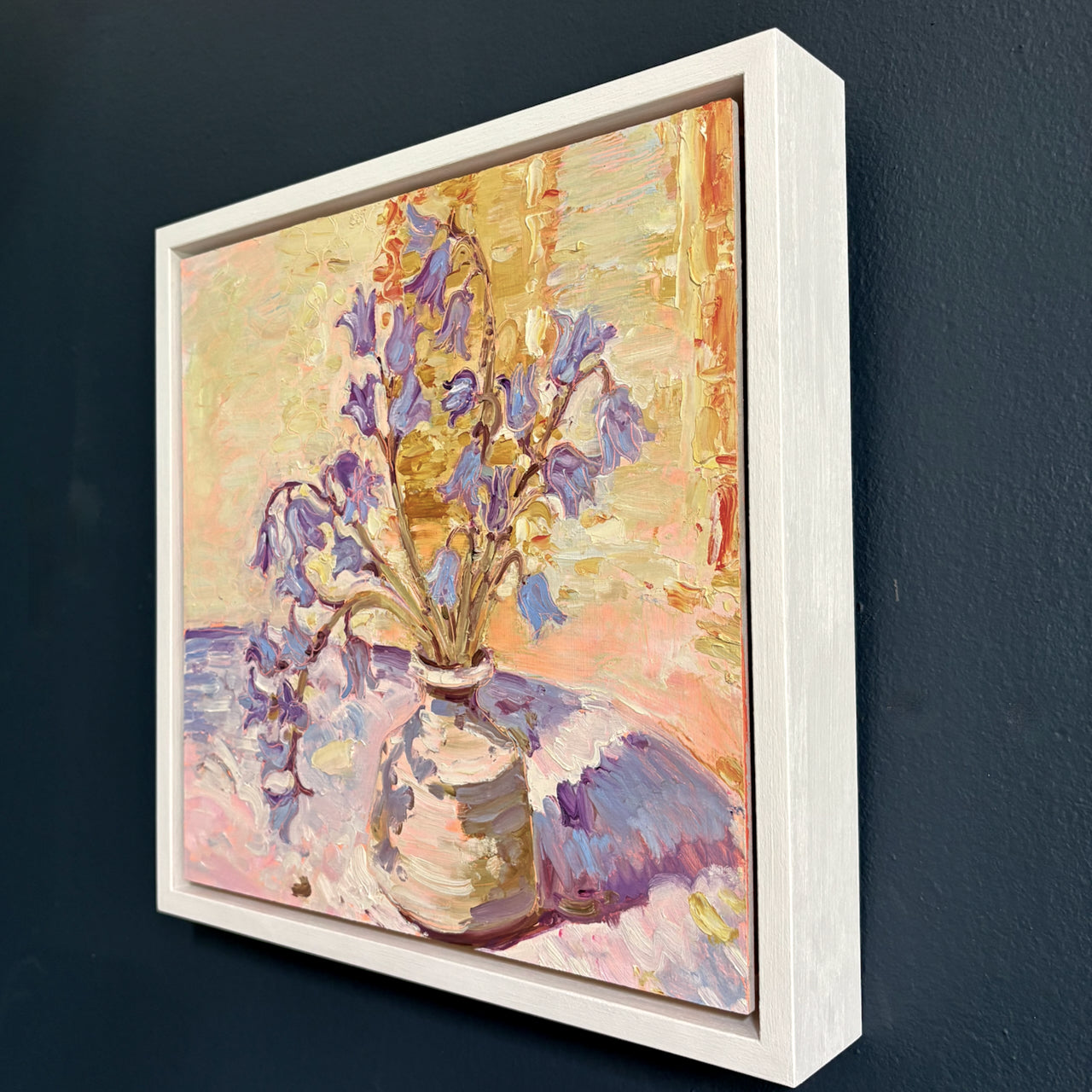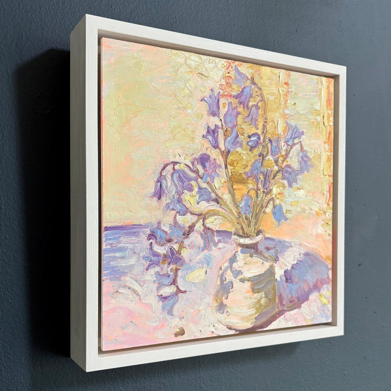 Oil on board, framed in a white painted tray frame